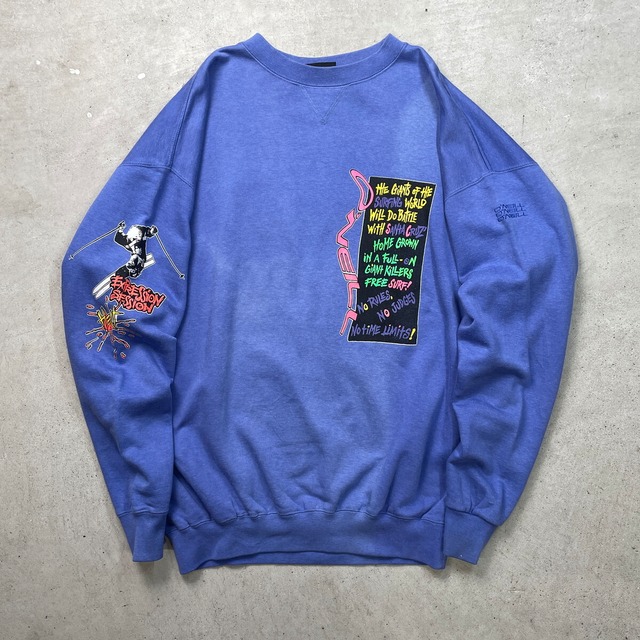 90年代 O'NEILL オニール グラフィックプリント スウェットシャツ メンズXL 古着 90s ヴィンテージ VINTAGE トレーナー オールドサーフ オールドスケート スキー 袖プリ 前Vガゼット 脇下ガゼット ブルーパープル【スウェット】/パープル