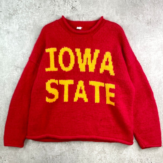エクアドルニットタイプ IOWA STATE カレッジ ロールネック ローゲージ ウールニットセーター メンズXL相当 古着 80s ヴィンテージ VINTAGE 赤【ニットセーター】/レッド
