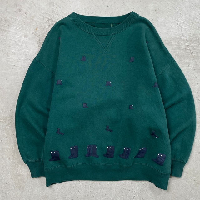 UNKNOWN レインブーツ フロッキープリント スウェットシャツ メンズM~L相当 レディース 古着 トレーナー クルーネック 長靴 フォレストグリーン【スウェット】/グリーン【SS26-50】