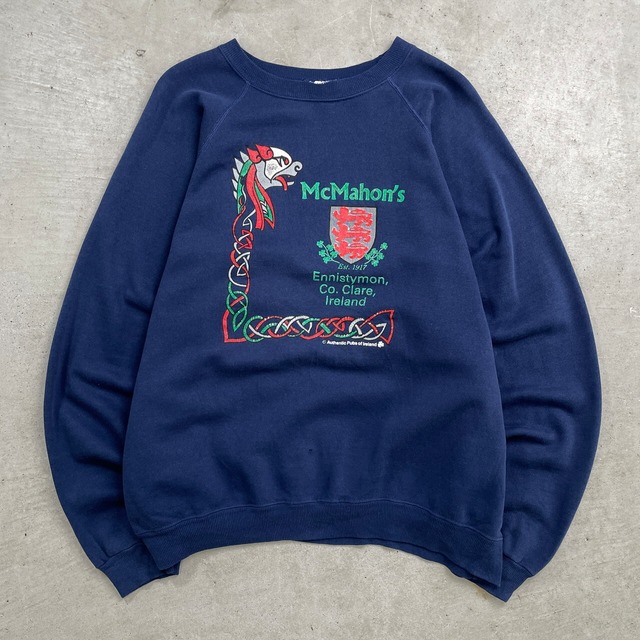 80年代 USA製 MCMAHON'S 企業ロゴプリント ラグランスウェットシャツ ケルト柄 メンズXL相当 古着 80s VINTAGE ヴィンテージ フェードネイビー 紺色【スウェット】/ネイビー【SS26-50】