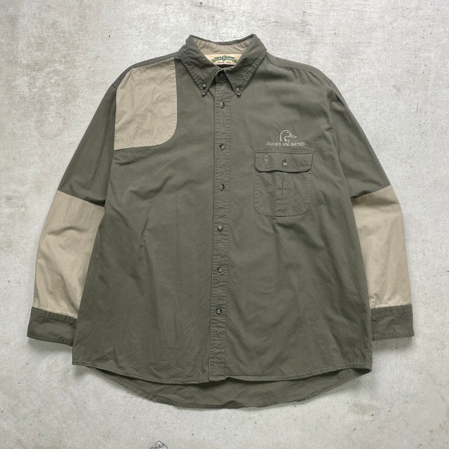 bob allen ボブアレン ハンティングシャツ ガンパッチ 袖切り替え ボタンダウン メンズ2XL相当 古着 企業ロゴ刺繍 VINTAGE ヴィンテージ ベージュ カーキ【長袖シャツ】/カーキグリーン【SS26-50】