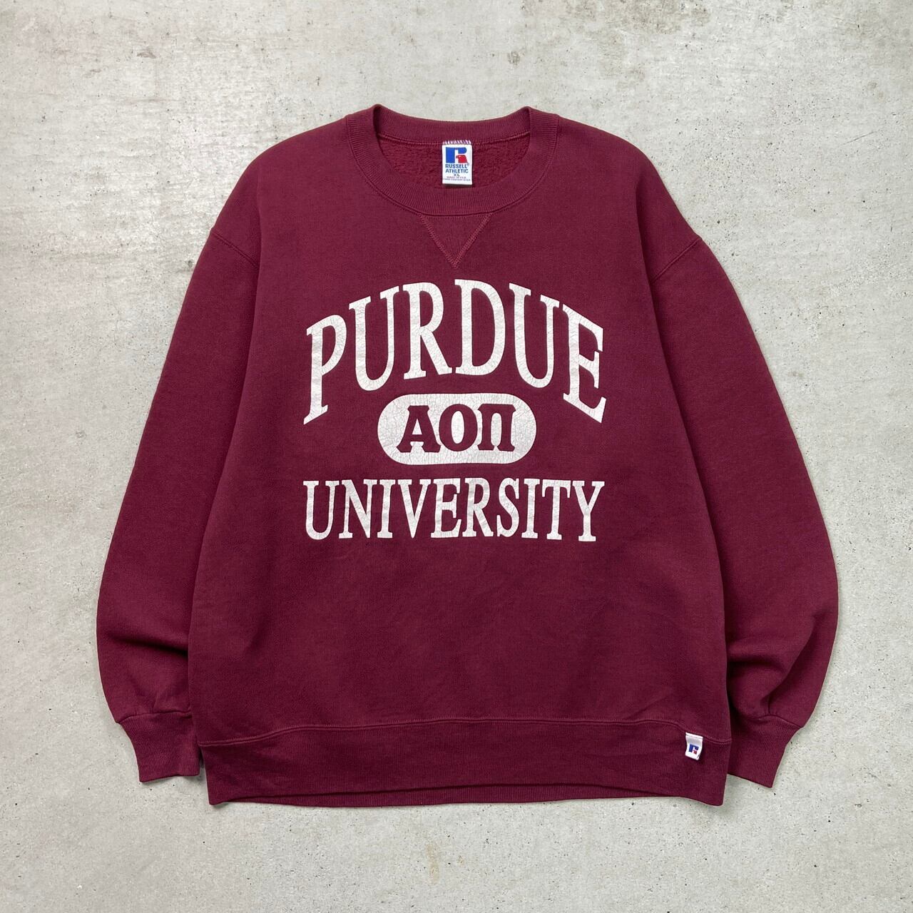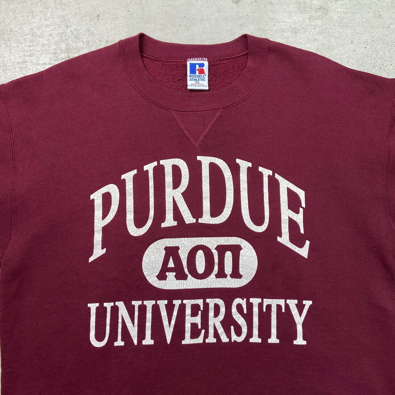 90年代 USA製 RUSSELL ATHLETIC ラッセル PURDUE UNIVERSITY 3段 カレッジロゴプリント スウェットシャツ メンズXL 古着 90s ヴィンテージ VINTAGE 前Vガゼット アメカジ トレーナー 刺繍タグ【スウェット】/ワインレッド