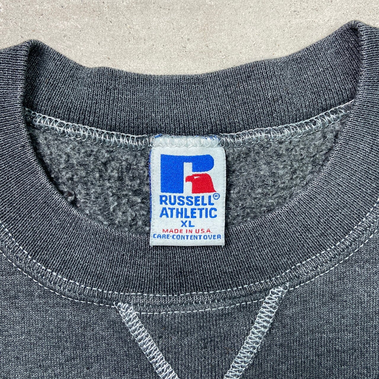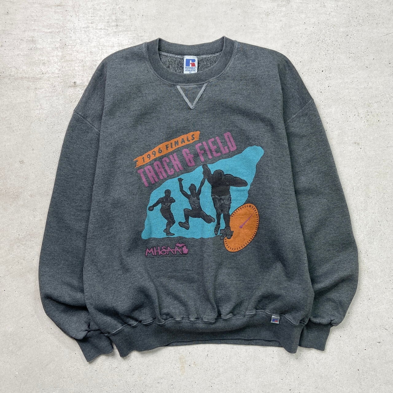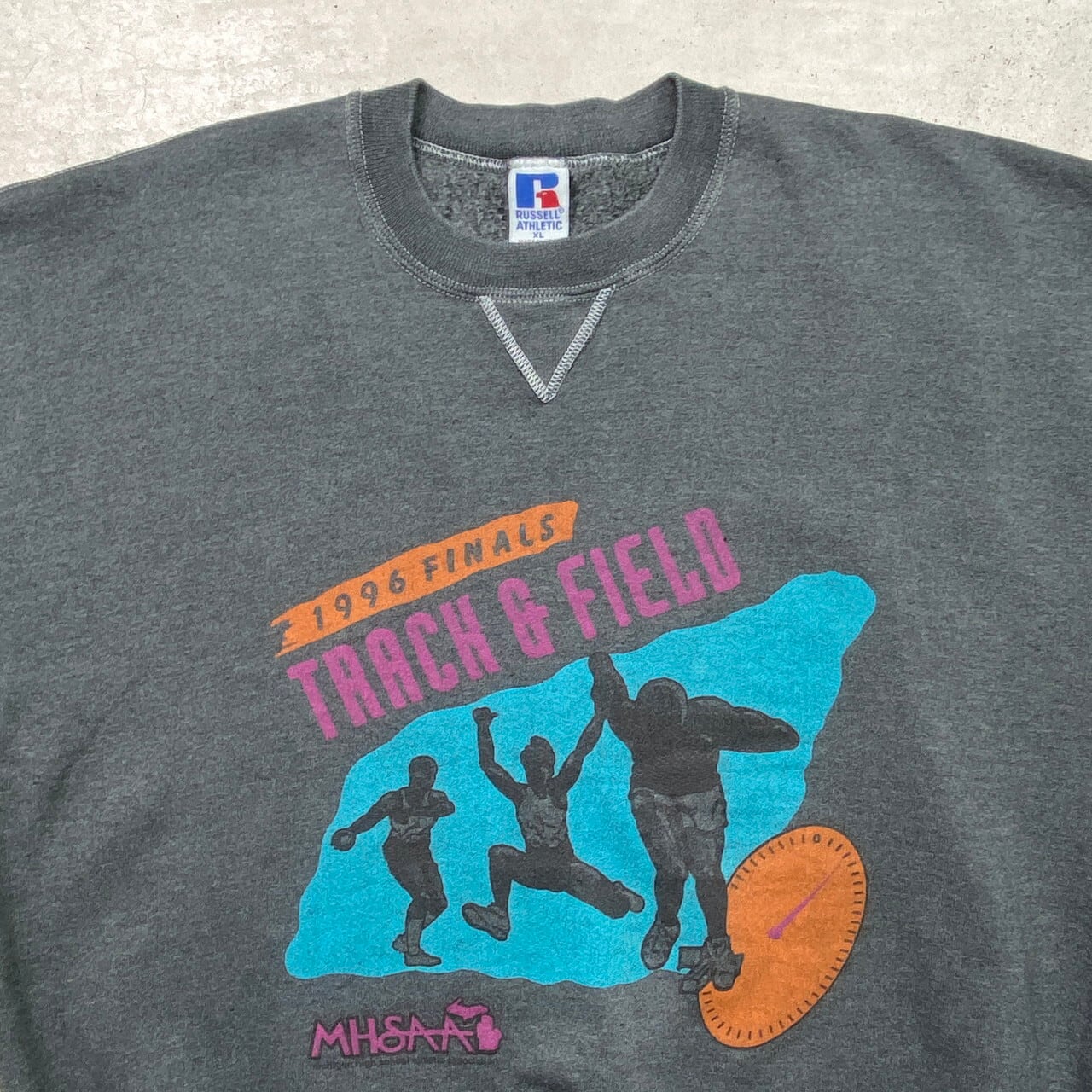 90年代 USA製 RUSSELL ATHLETIC ラッセル MHSAA スポーツプリント 後染め スウェットシャツ メンズXL 古着 90s ヴィンテージ VINTAGE 前Vガゼット アメカジ トレーナー 刺繍タグ 灰色【スウェット】/グレーSS30