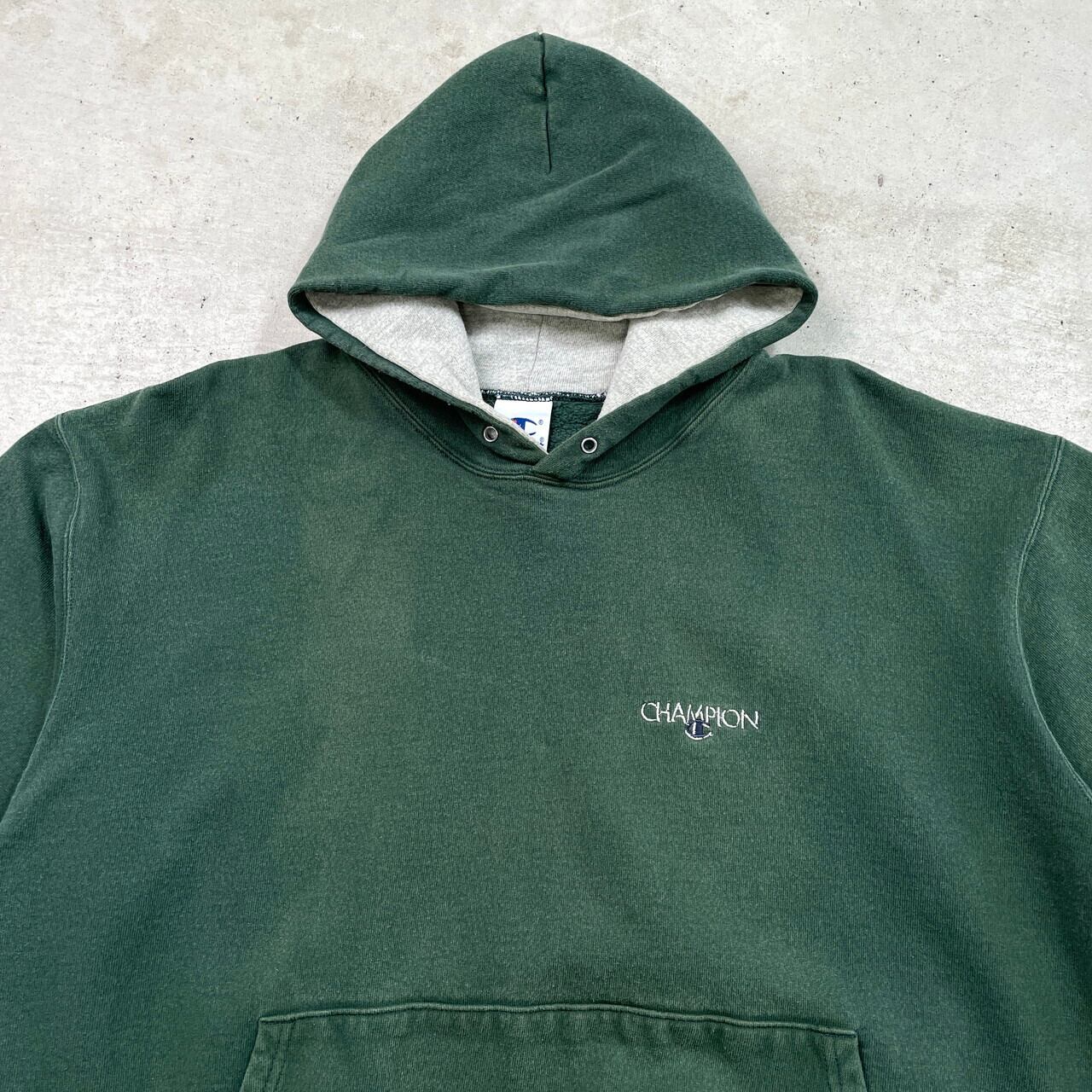 90年代 Champion チャンピオン スウェットパーカー サンフェード メンズXL相当 古着 90s ヴィンテージ VINTAGE アメカジ ワンポイントロゴ刺繍 フーディー フェード 緑色【パーカー】/グリーン