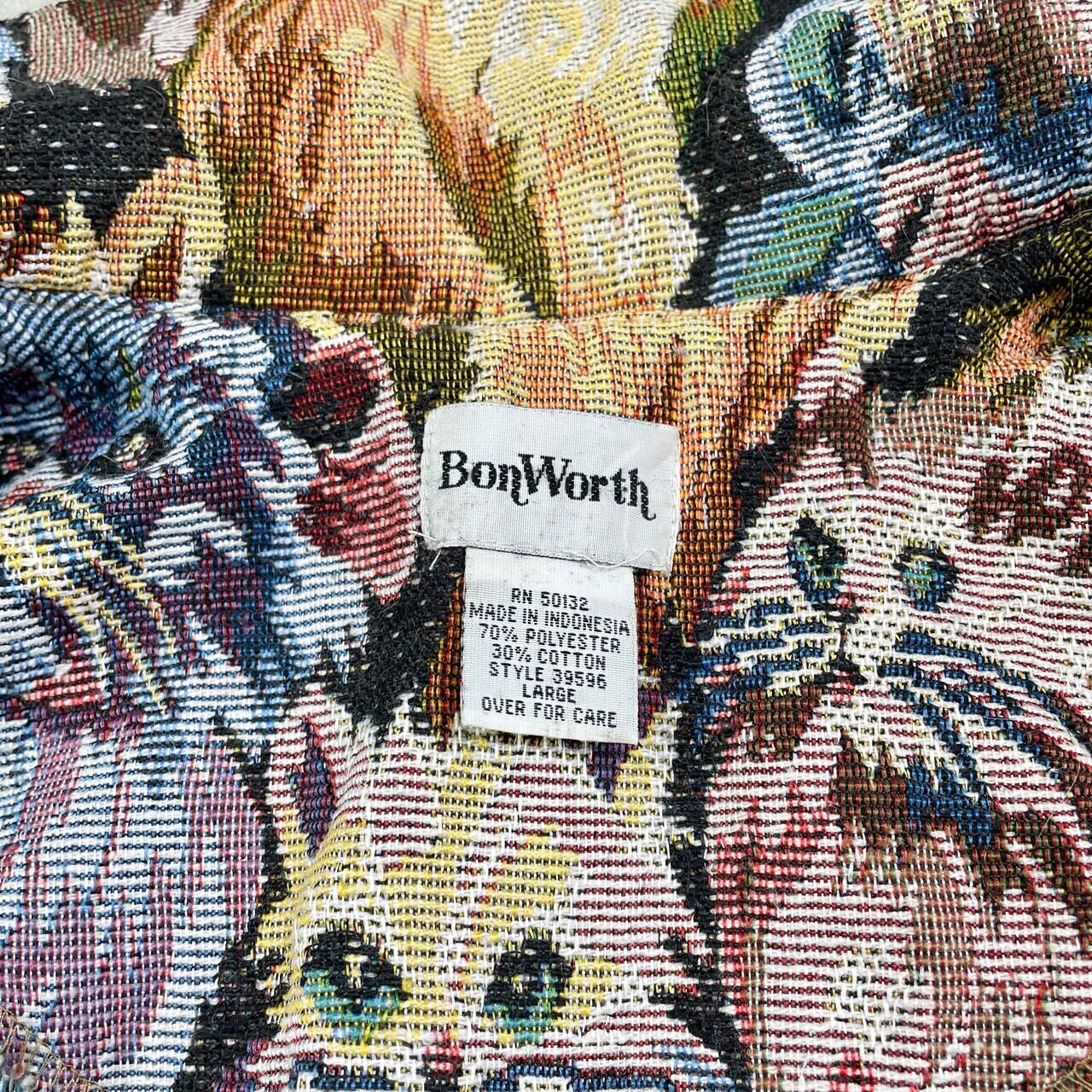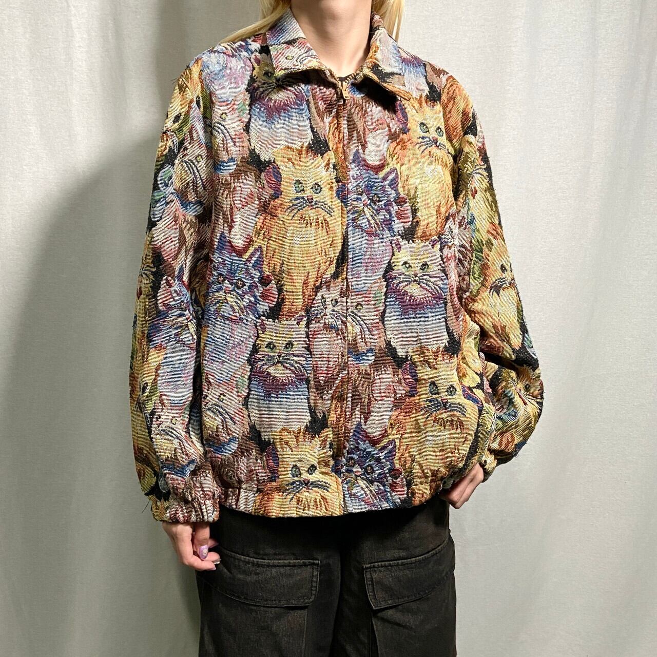 Bon Worth フルジップ ゴブランジャケット 総柄 ネコ アニマル柄 デザインジャケット レディースL 古着 ジャガード キャット 猫 ねこ【ブルゾン・ジャケット】/マルチカラー
