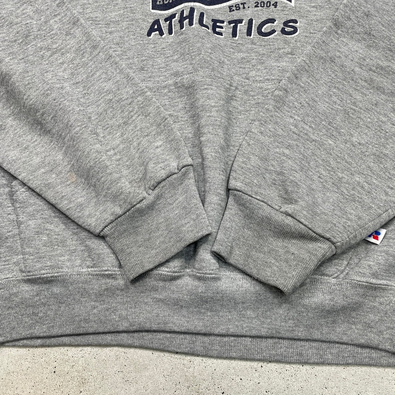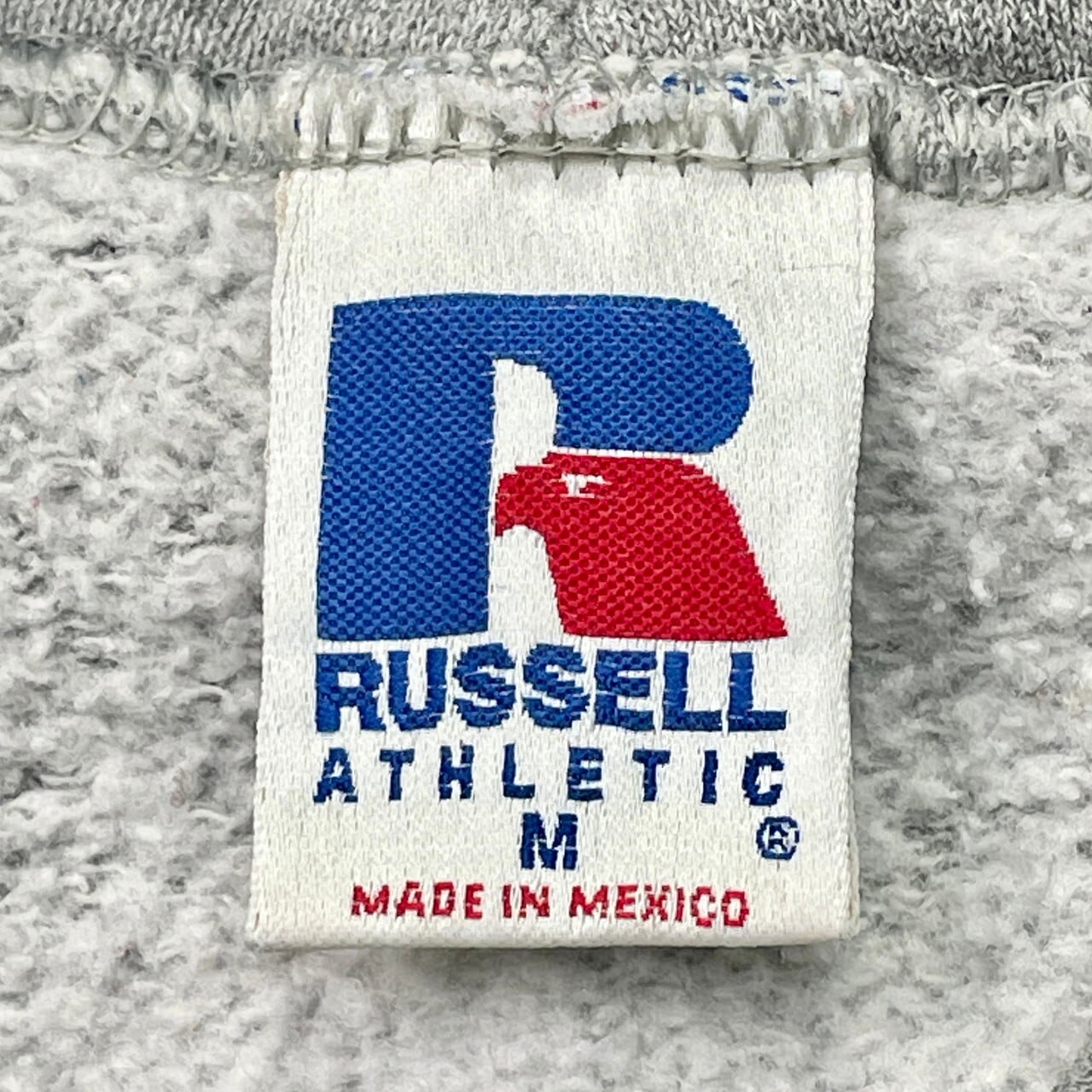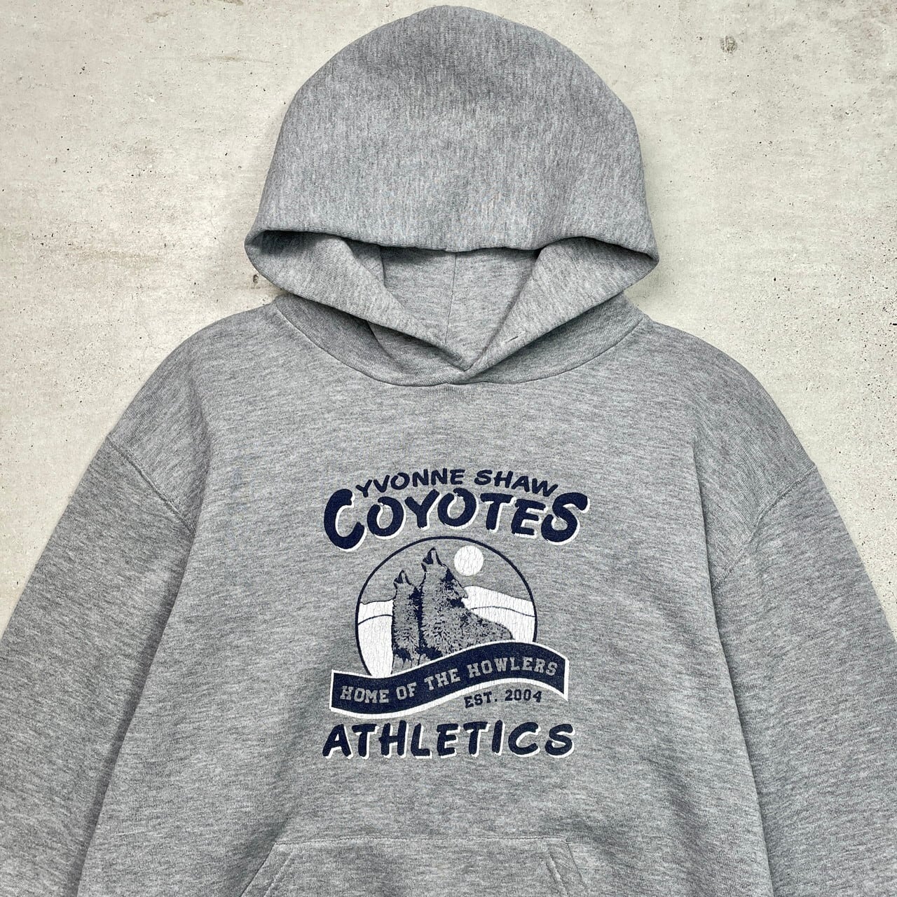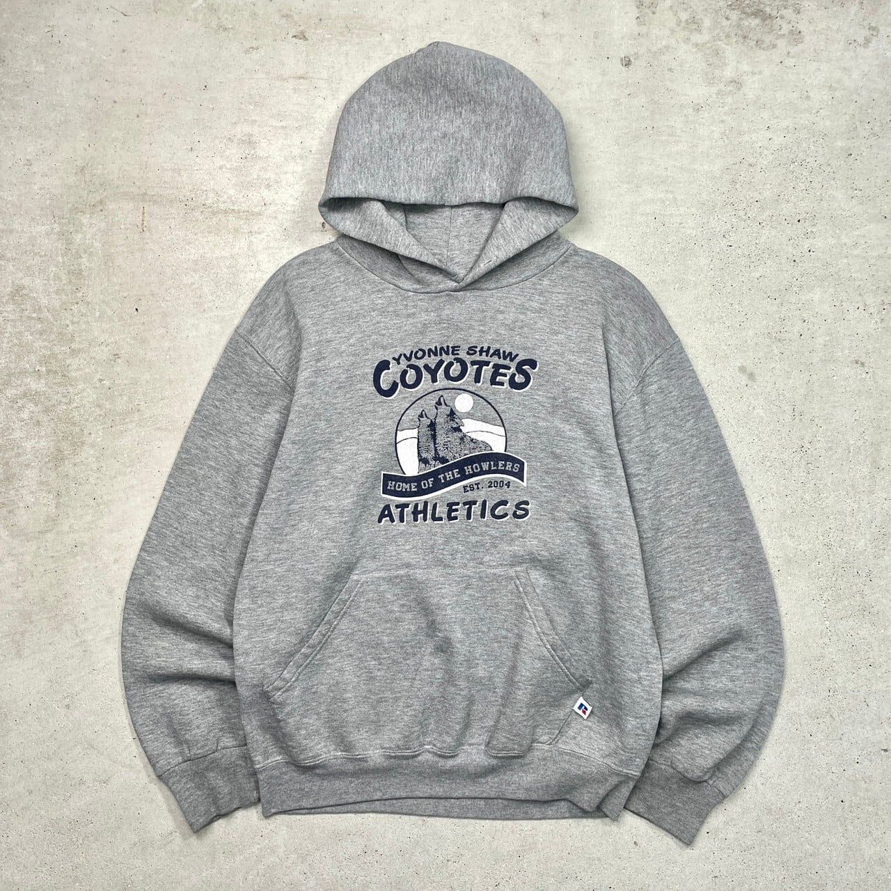 00年代 刺繍タグ RUSSELL ATHLETIC ラッセル カレッジチームロゴプリント スウェットパーカー メンズM 古着 00s Y2K VINTAGE ヴィンテージ プルオーバーパーカー フーディー アニマル ウルフ オオカミ 狼 灰色【パーカー】/グレーSS30