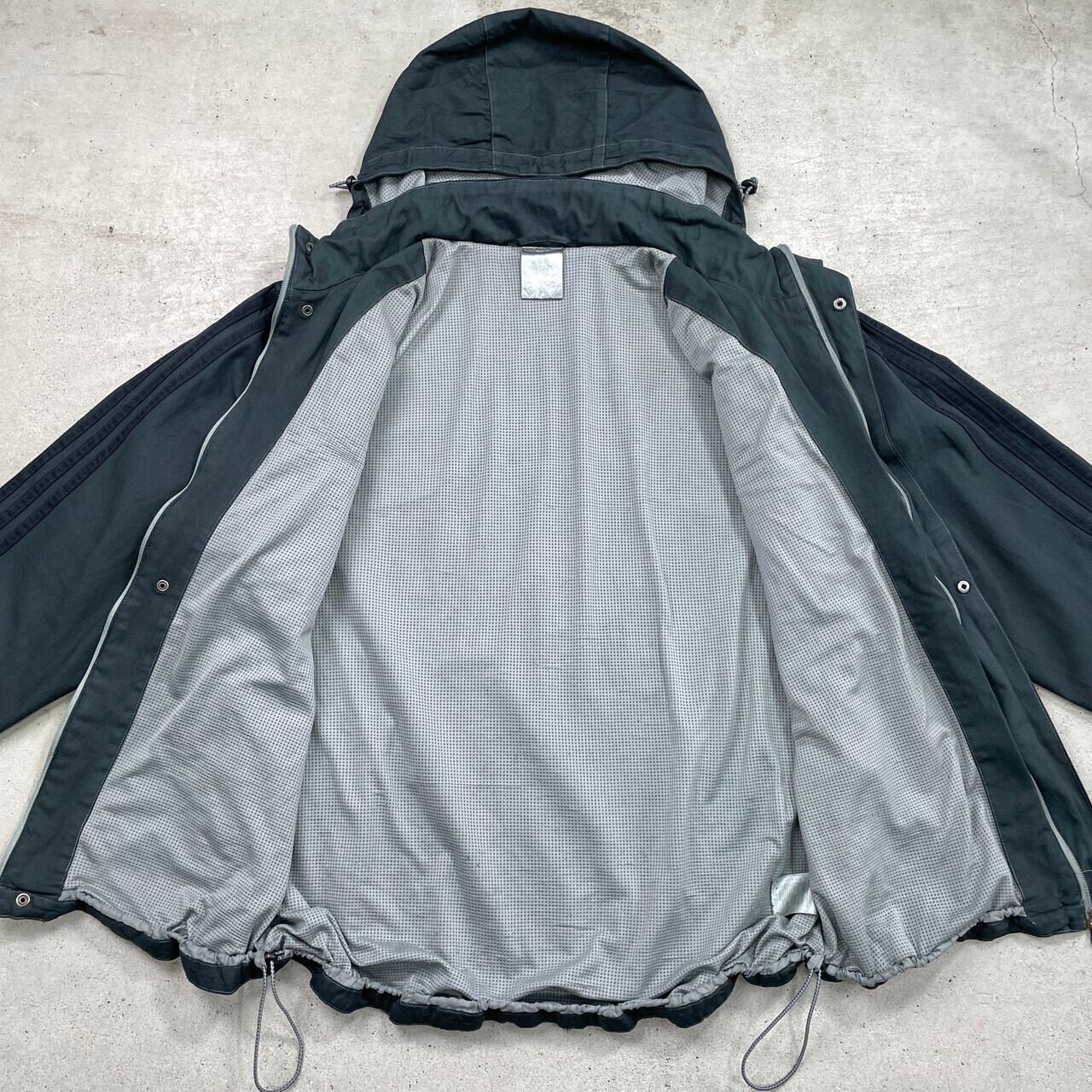 00年代 adidas アディダス 後染めブラック ダックジャケット メンズL相当 古着 00s ヴィンテージ VINTAGE Y2K テック系 メッシュライナー サイドライン フード収納型 墨黒 黒色【コットンジャケット】/ブラック