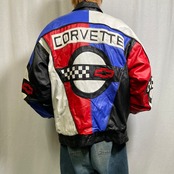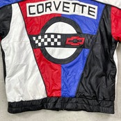 90年代 CORVETTE コルベット レザージャケット クレイジーパターン メンズ2XL相当 古着 90s ヴィンテージ VINTAGE CHEVROLET シボレー チェッカーフラッグ 革ジャン 肩パッド レッド ブルー ホワイト ブラック 赤色 青色 黒 白 ビッグサイズ 大きいサイズ【ブルゾン・ジャケット】/マルチカラー【SS26-30a】