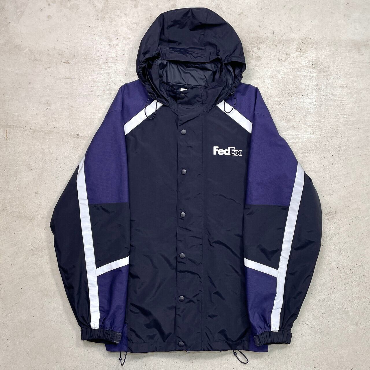 ■FedEx フェデックス リフレクターライン ナイロンパーカー メンズXL相当 古着 企業ロゴ刺繍 ドローコード ブラック パープル 黒 紫色 フード収納式 マウンテンパーカー ナイロンジャケット ワークジャケット【ナイロンジャケット】/マルチカラー