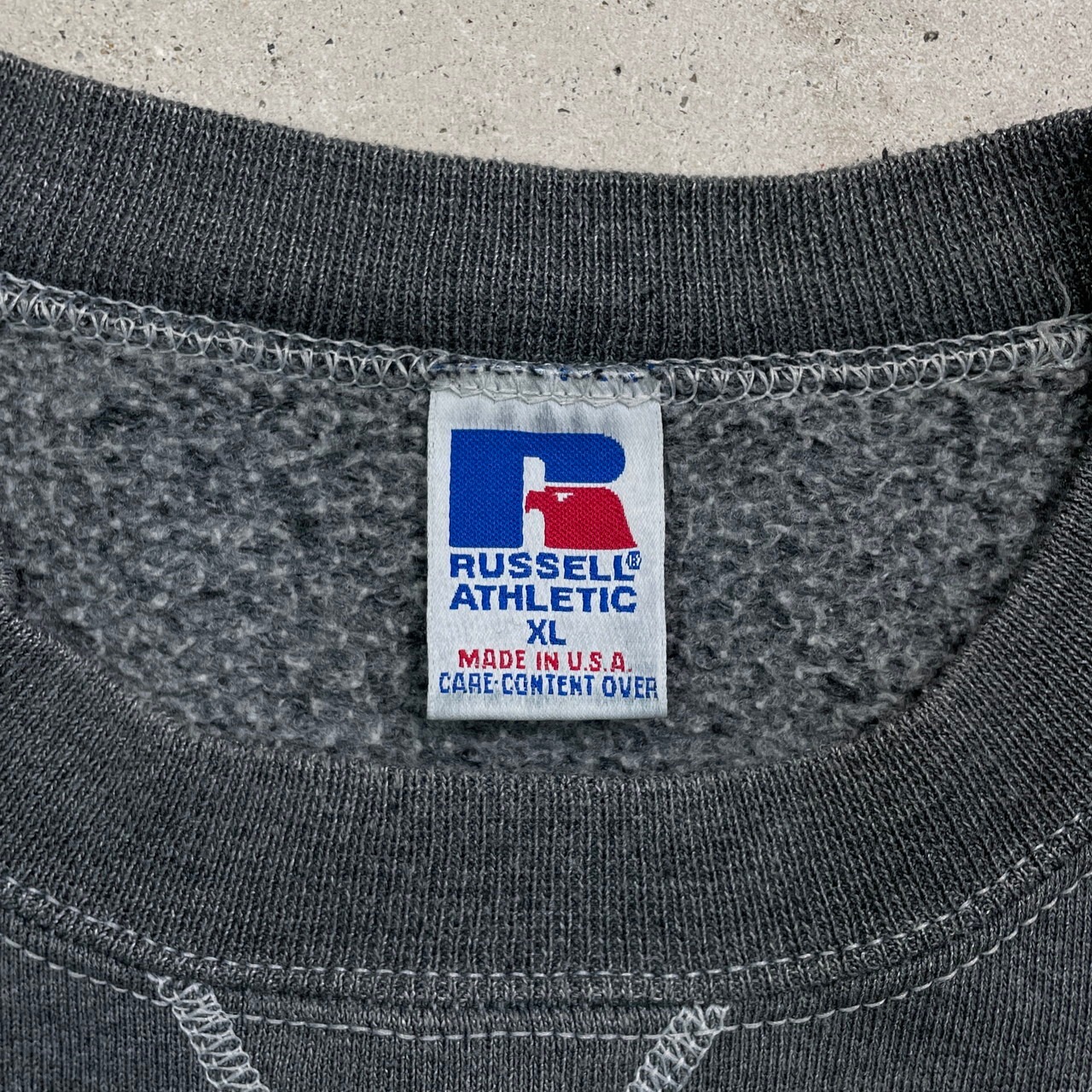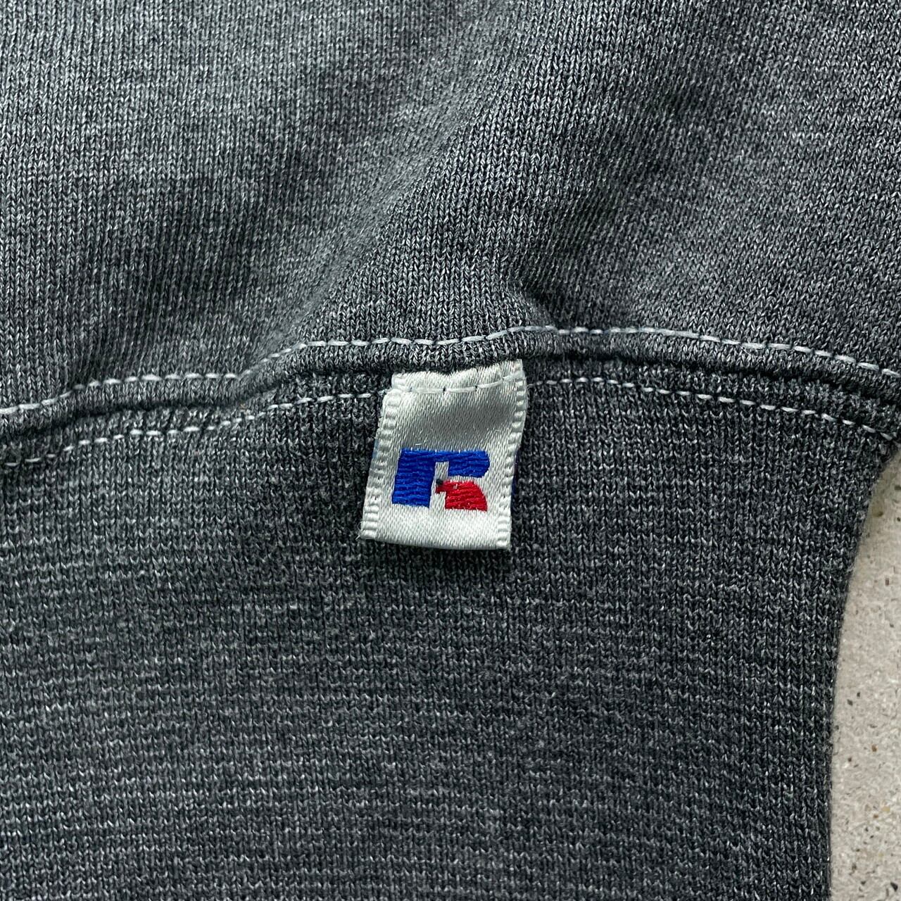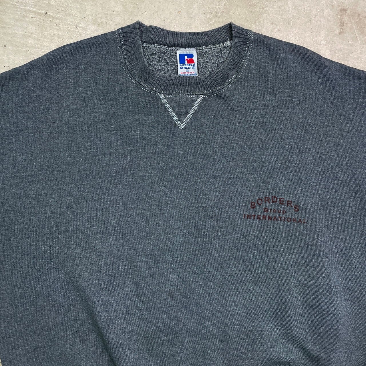 90年代 USA製 RUSSELL ATHLETIC ラッセル BORDERS Group INTERNATIONAL 企業ロゴプリント 後染め スウェットシャツ メンズXL 古着 90s ヴィンテージ VINTAGE 前Vガゼット アメカジ トレーナー ボーダーズグループ 刺繍タグ ダークグレー 墨黒【スウェット】/グレーSS30