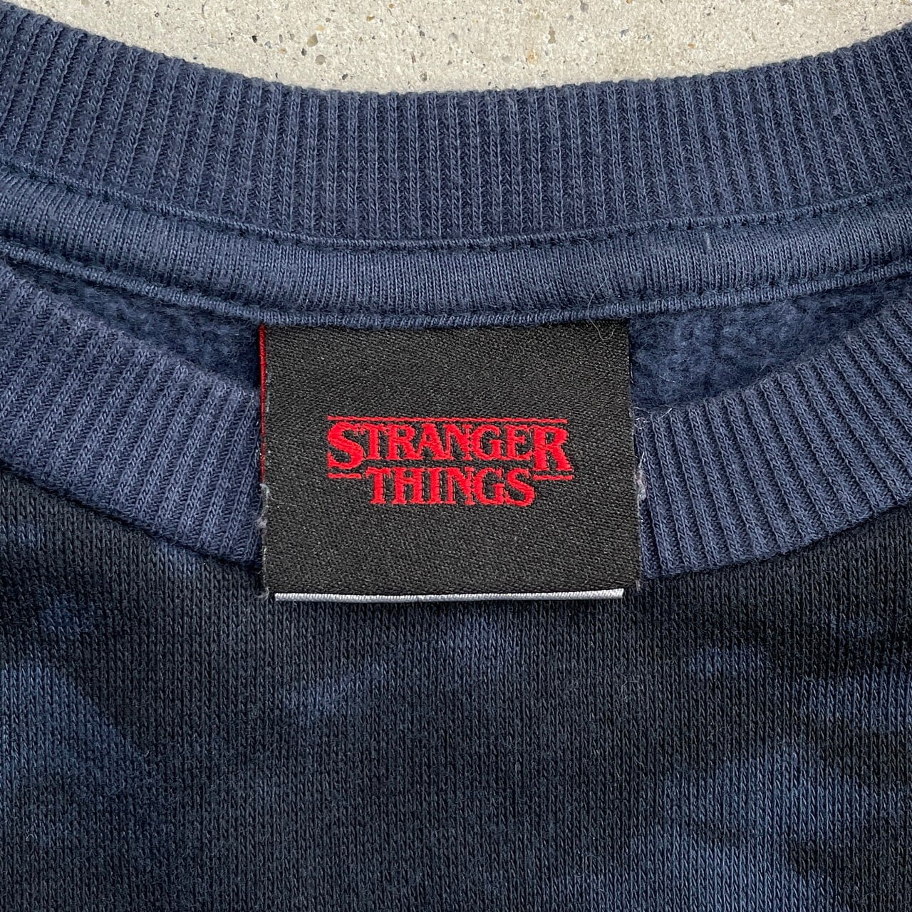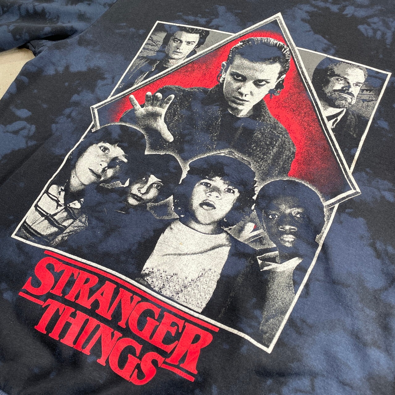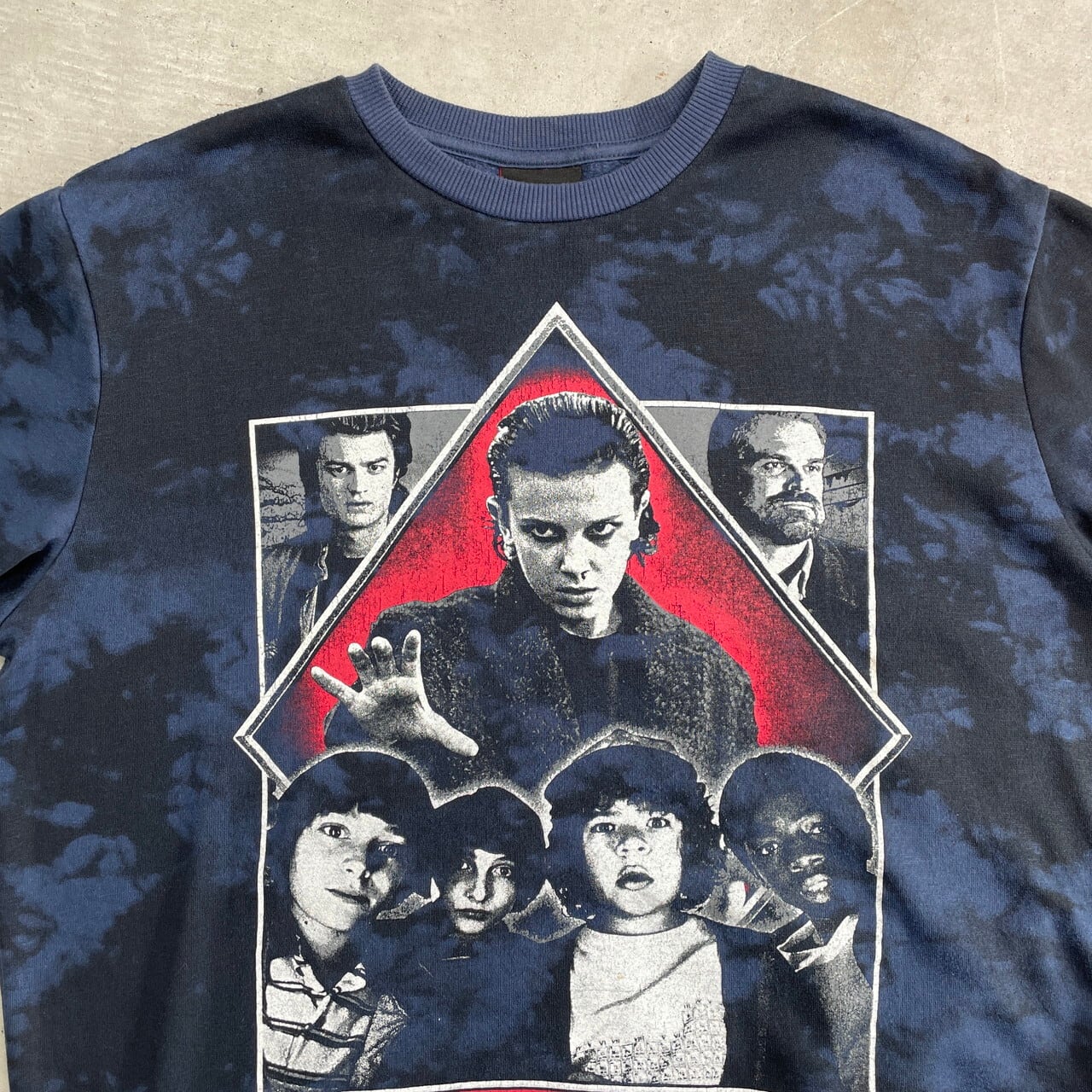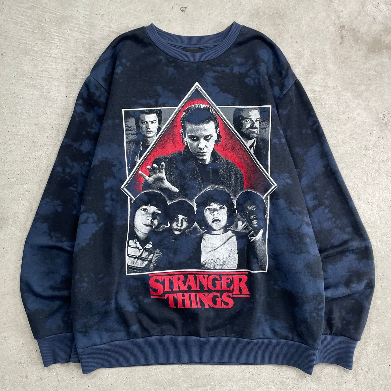 ストレンジャーシングス キャラクタープリント スウェットシャツ メンズL 古着 STRANGER THINGS ドラマ ムービー 映画 タイダイ ブルー ブラック 青色 黒色【スウェット】/マルチカラーSS30