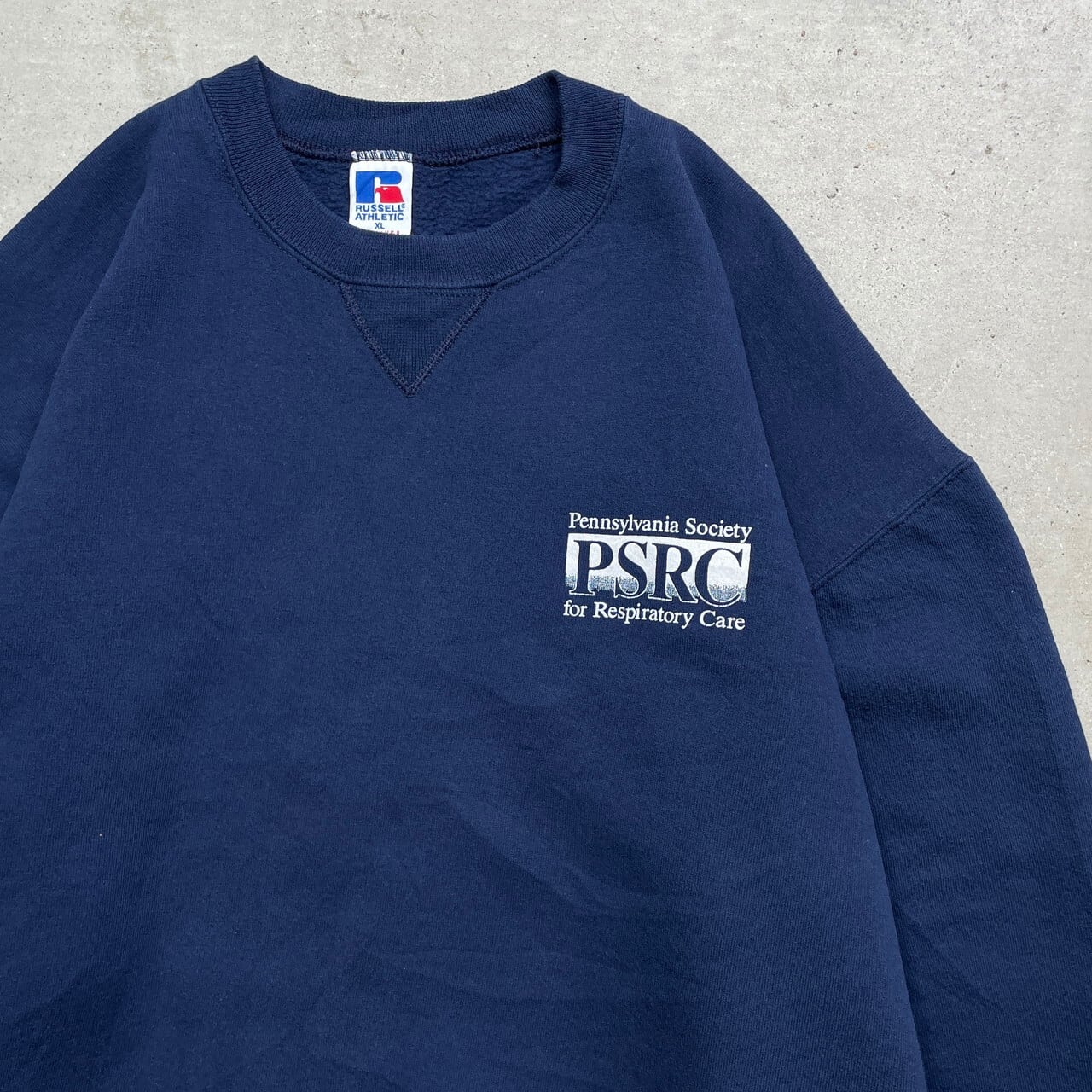 ■90年代 USA製 RUSSELL ATHLETIC ラッセル スウェットシャツ ワンポイントロゴプリント メンズXL 古着 90s ヴィンテージ VINTAGE 前Vガゼット アメカジ トレーナー 刺繍タグ 紺色 【スウェット】/ネイビー