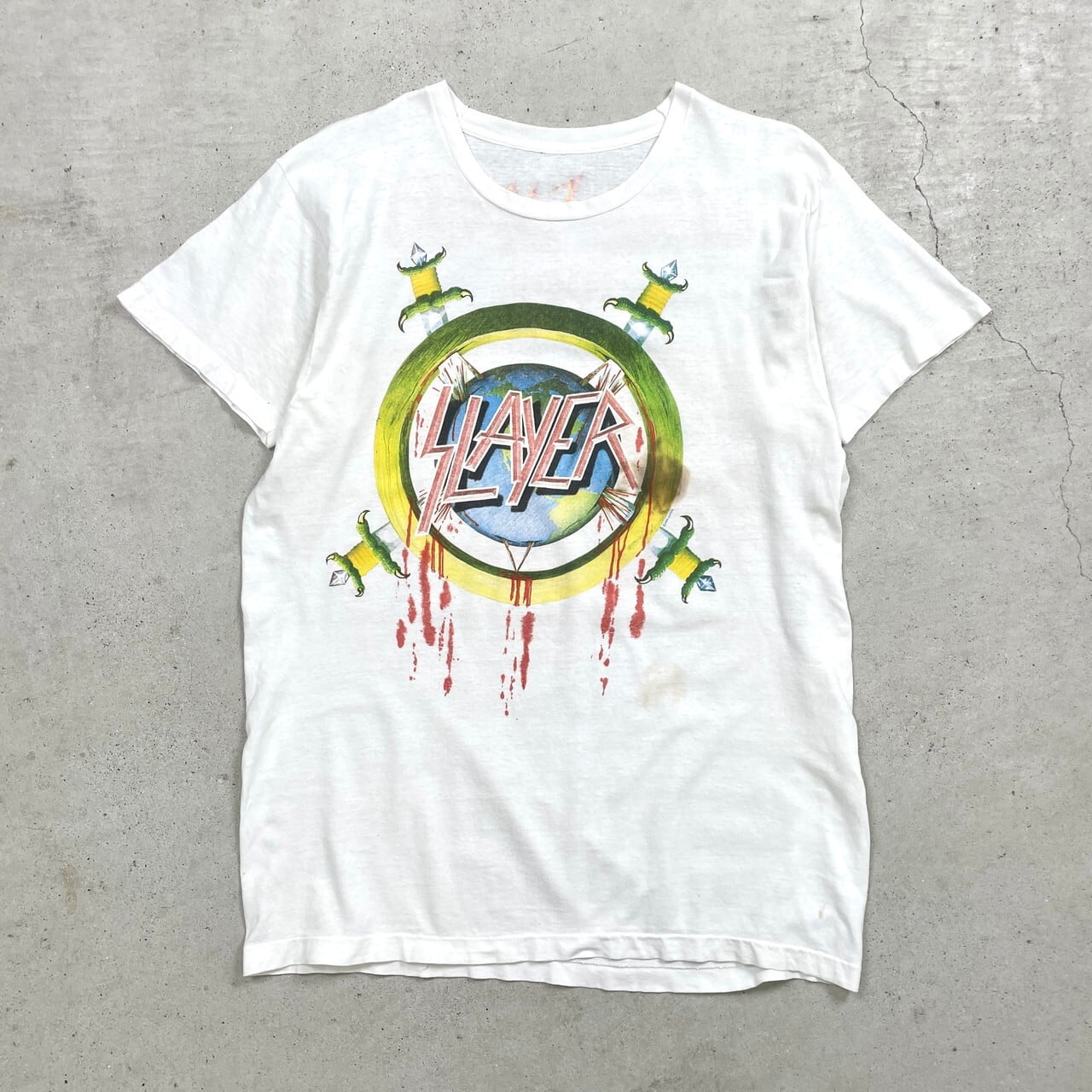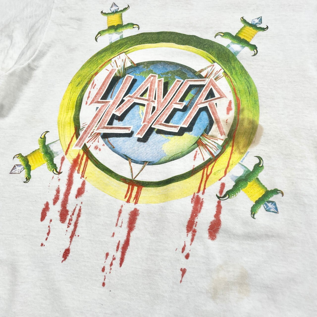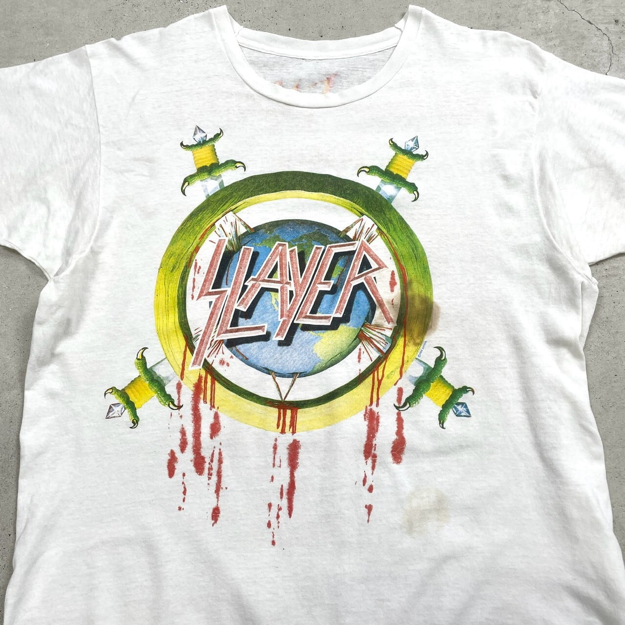 80年代 SLAYER スレイヤー バンドTシャツ バンT WORLD SACRIFICE TOUR メンズL-XL相当 古着 80s シングルステッチ ヴィンテージ VINTAGE 両面プリント 白色【Tシャツ】/ホワイト【SS30】
