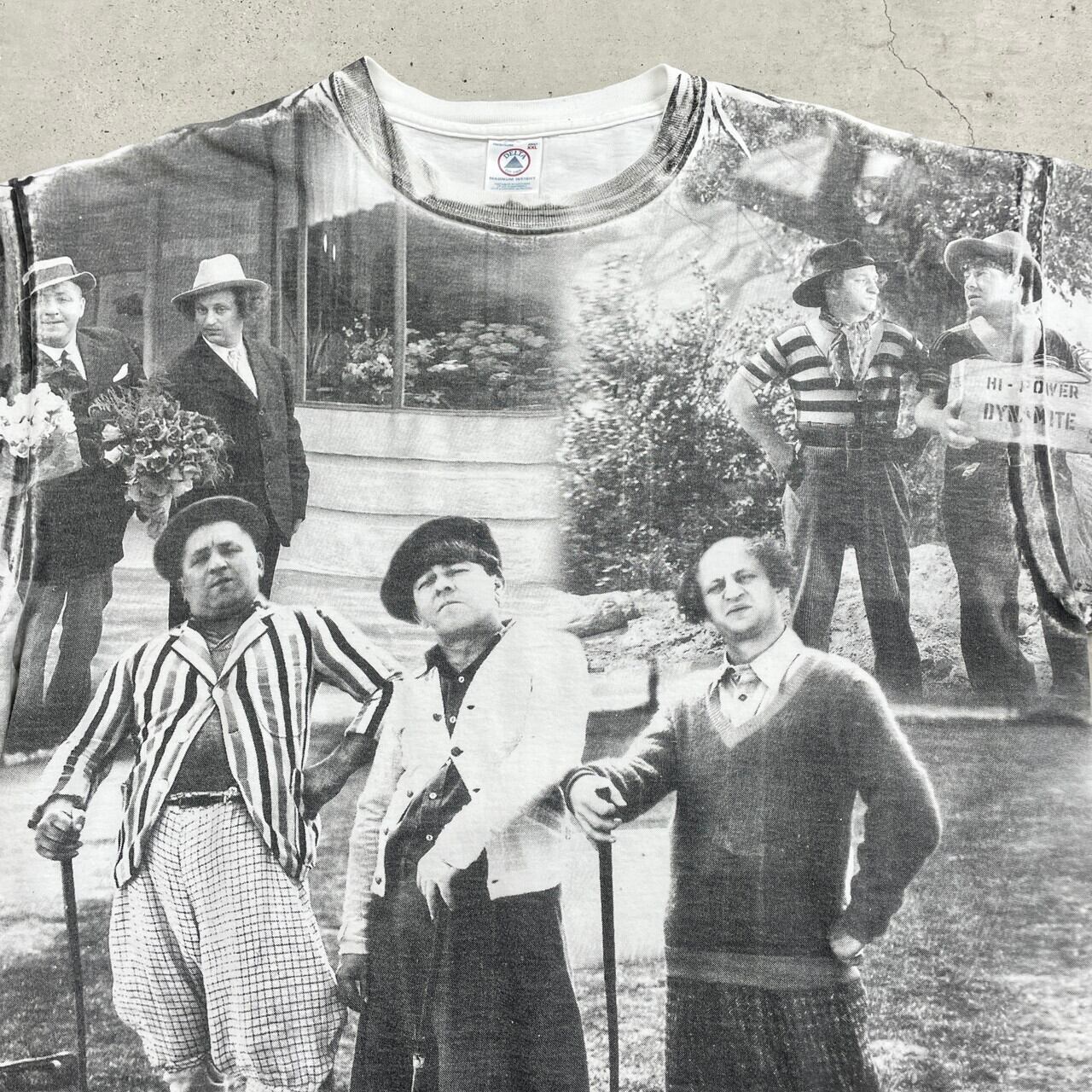 ■90年代 The Turee Stooges 三ばか大将 コメディ オールオーバープリントTシャツ 総柄 メンズ2XL 古着 90s ヴィンテージ VINTAGE 俳優 ムービー 映画 白黒【Tシャツ】/ホワイト