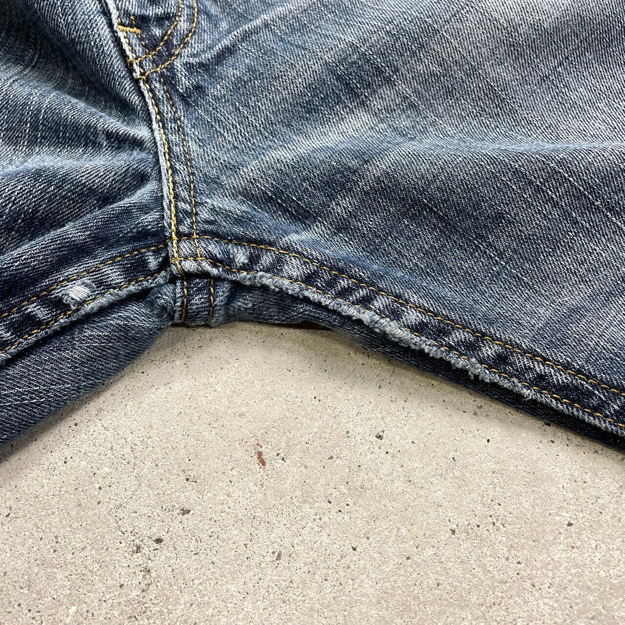 【状態】右太もも付近に汚れ、バックポケット・股下・裾に生地擦れ・バックポケットにリペア跡などがございます。