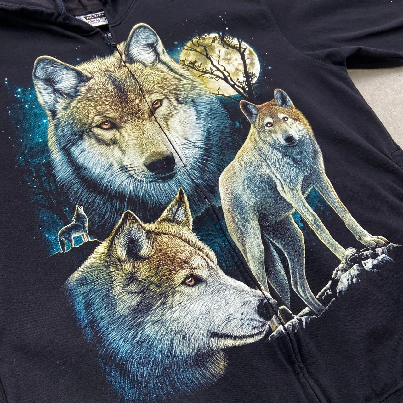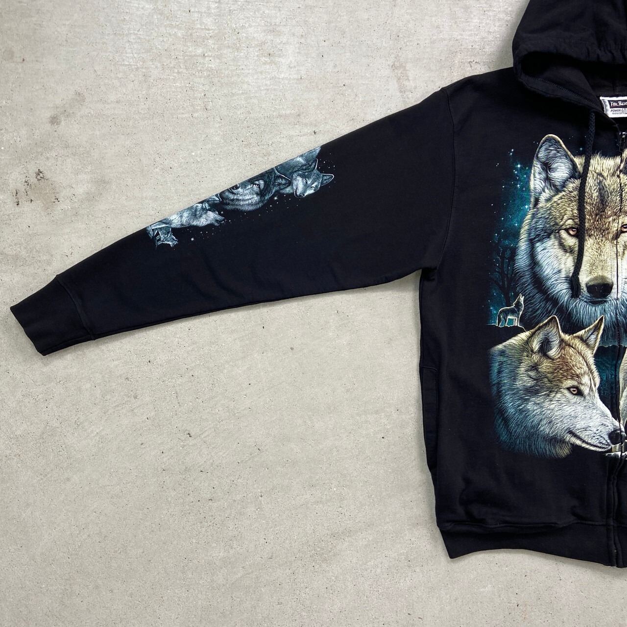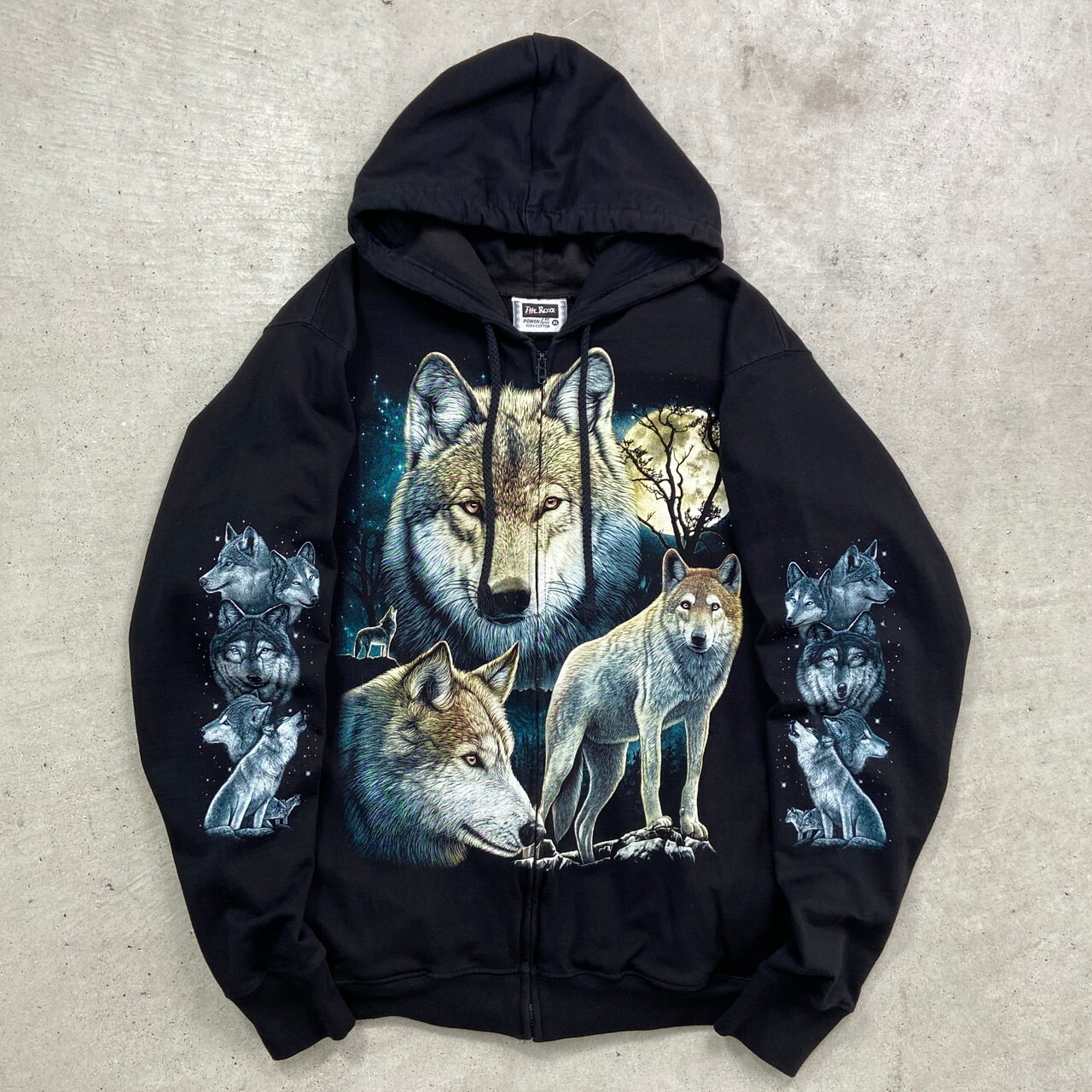 00年代 オオカミ 総柄アニマルプリント スウェットパーカー フルジップパーカー メンズXL 古着 00s Y2K VINTAGE ヴィンテージ アメカジ フーディー トレーナー 袖プリ 狼 ウルフ 黒色 【パーカー】/ブラックSS30