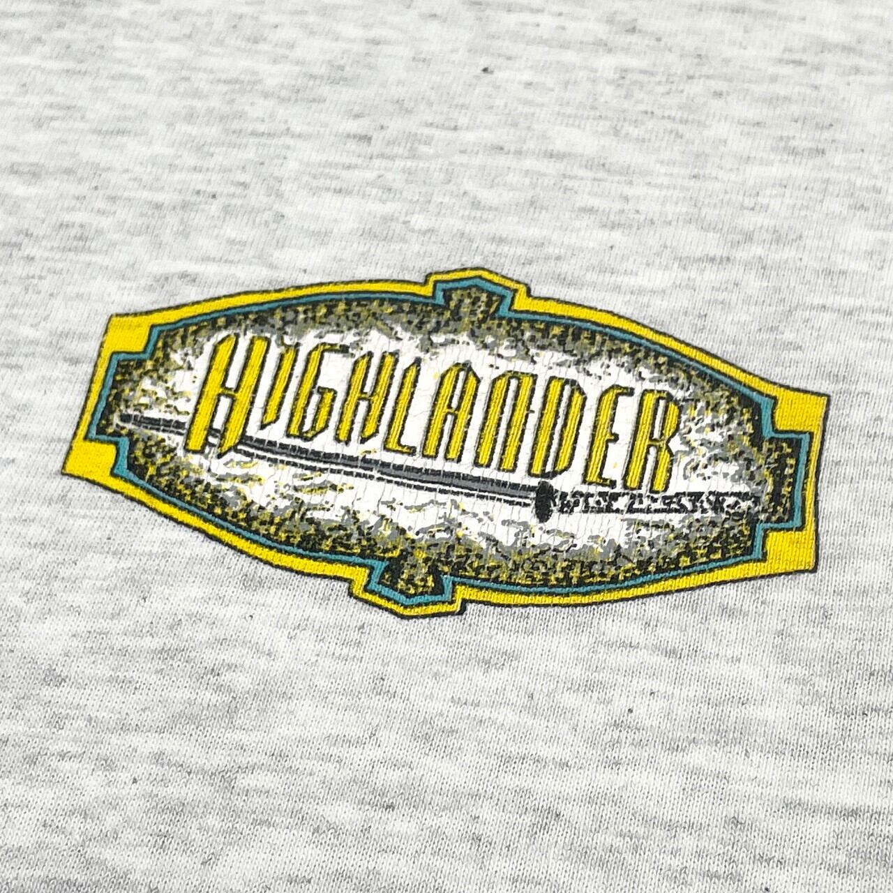 90年代 HIGHLANDER 刀剣 ムービー プリントTシャツ メンズXL 古着 90s シングルステッチ ヴィンテージ VINTAGE 映画 両面プリント バックプリント 杢グレー【Tシャツ】/グレー