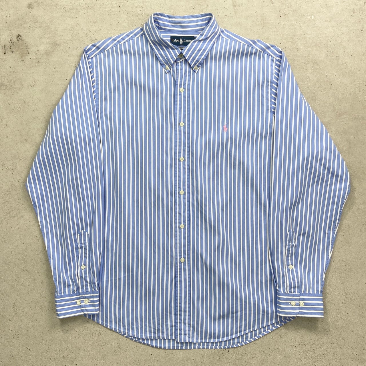 90年代 Ralph Lauren ラルフローレン CUSTOM FIT ストライプシャツ メンズXL 古着 90s ヴィンテージ VINTAGE ボタンダウンシャツ ホワイト サックスブルー 白 水色【長袖シャツ】/マルチカラー