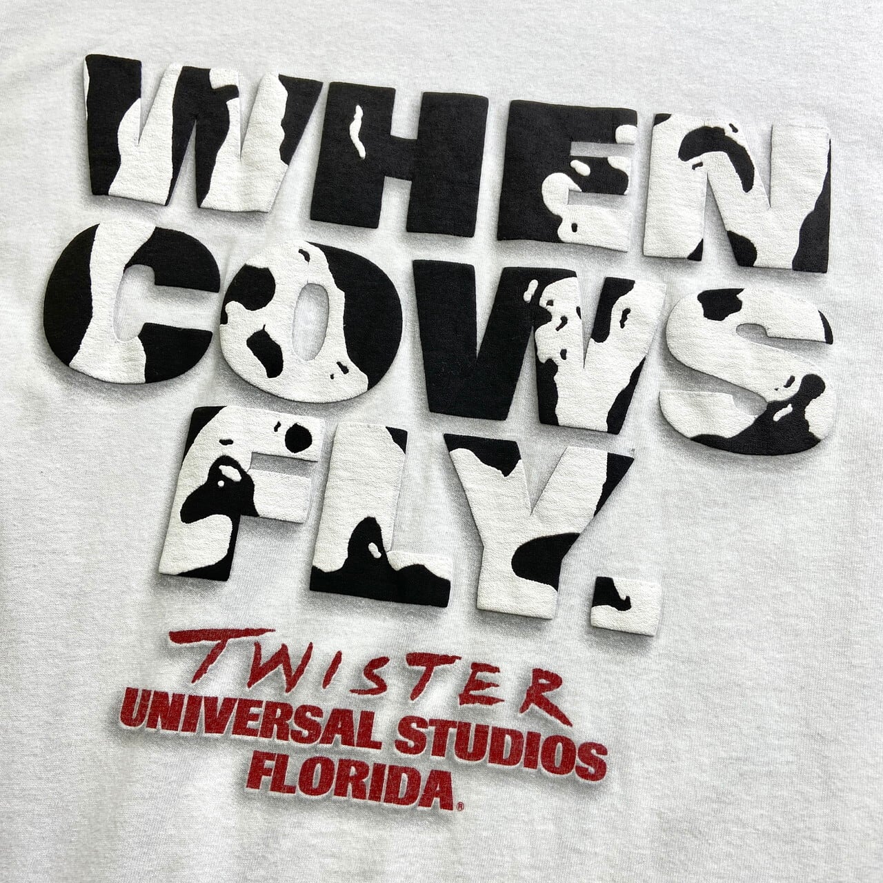 ■90年代 UNIVERSAL STUDIOS TWISTER ムービープリントTシャツ メンズL相当 古着 90s ヴィンテージ VINTAGE WHEN COWS FLY 映画 牛柄 白 【Tシャツ】/ホワイト