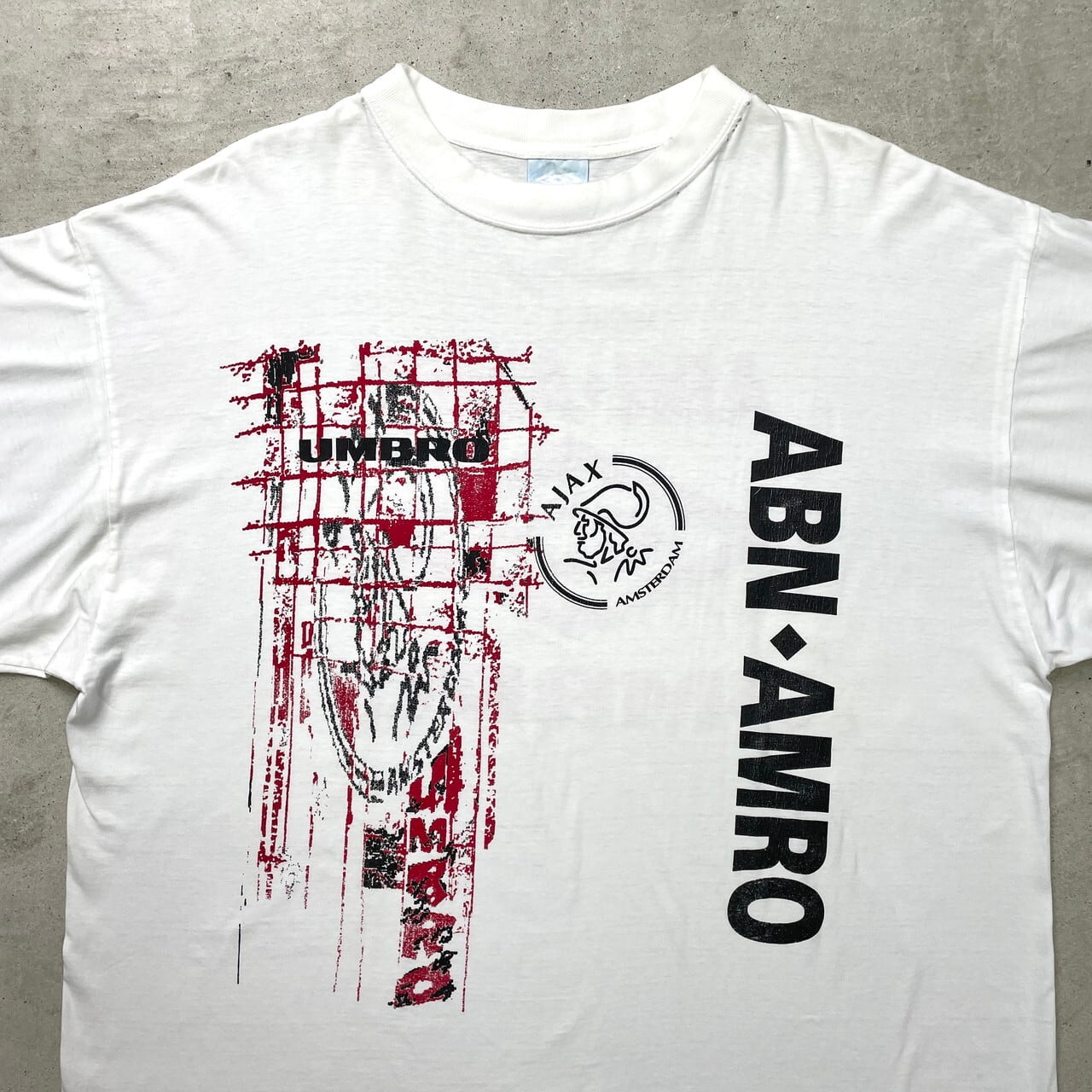 ■90年代 USA製 UMBRO アンブロ AJAX AMSTERDAM ロゴプリントTシャツ ボロ ダメージ メンズ2XL 古着 90s VINTAGE ヴィンテージ サッカーチーム アヤックス・アムステルダム ABN・AMRO 白 ビッグサイズ 大きいサイズ【Tシャツ】/ホワイト