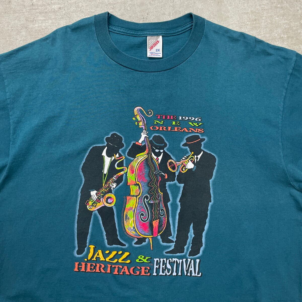 ■90年代 USA製 1996 JAZZ&HERITAGE FESTIVAL ジャズフェスティバル アートプリントTシャツ メンズ2XL 古着 90s VINTAGE ヴィンテージ NEW ORLEANS バンド ビッグサイズ 大きいサイズ 緑【Tシャツ】/グリーン