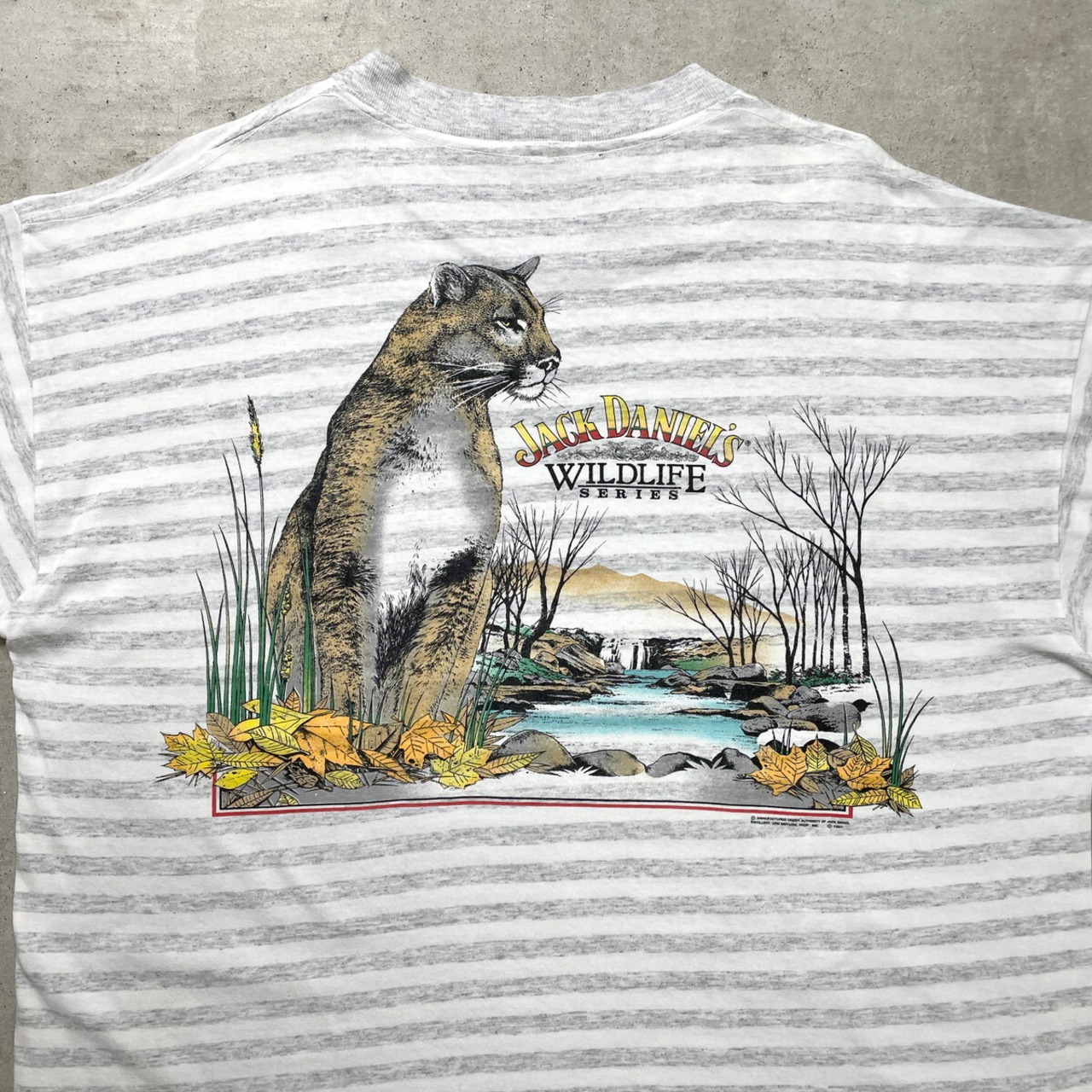 90年代 JACK DANIEL’S ジャックダニエル ボーダー 企業ロゴプリントTシャツ メンズXL相当 古着 1991 90s ヴィンテージ VINTAGE シングルステッチ アドバタイジング ウイスキー ピューマ アニマル WILDLIFE SERIES ホワイト ライトグレー 白 灰色【Tシャツ】/マルチカラー【SS50】