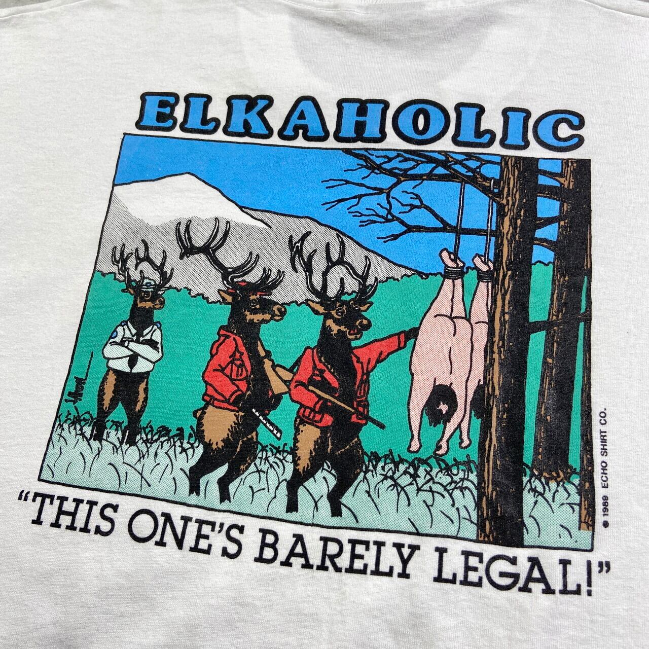■80~90年代 USA製 ELKAHOLIC ジョークプリントTシャツ アート アニマル シカ メンズL相当 古着 80s 90s VINTAGE ヴィンテージ シングルステッチ 動物 鹿 白【Tシャツ】/ホワイト