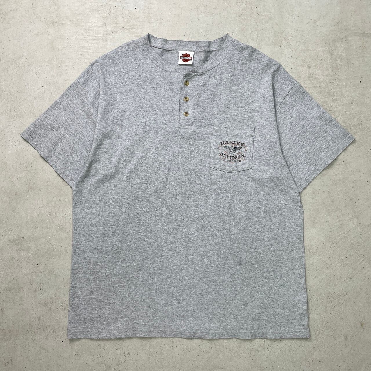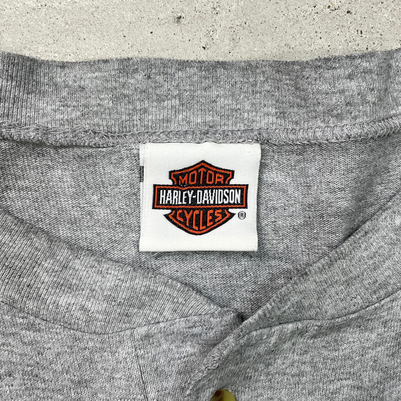 00年代 Harley-Davidson ハーレーダビッドソン ロゴプリントTシャツ ヘンリーネック ポケT ファイヤーパターン メンズ2XL相当 古着 00s Y2K ヴィンテージ VINTAGE バイク モーターサイクル 灰色 ビッグサイズ 大きいサイズ【Tシャツ】/グレー