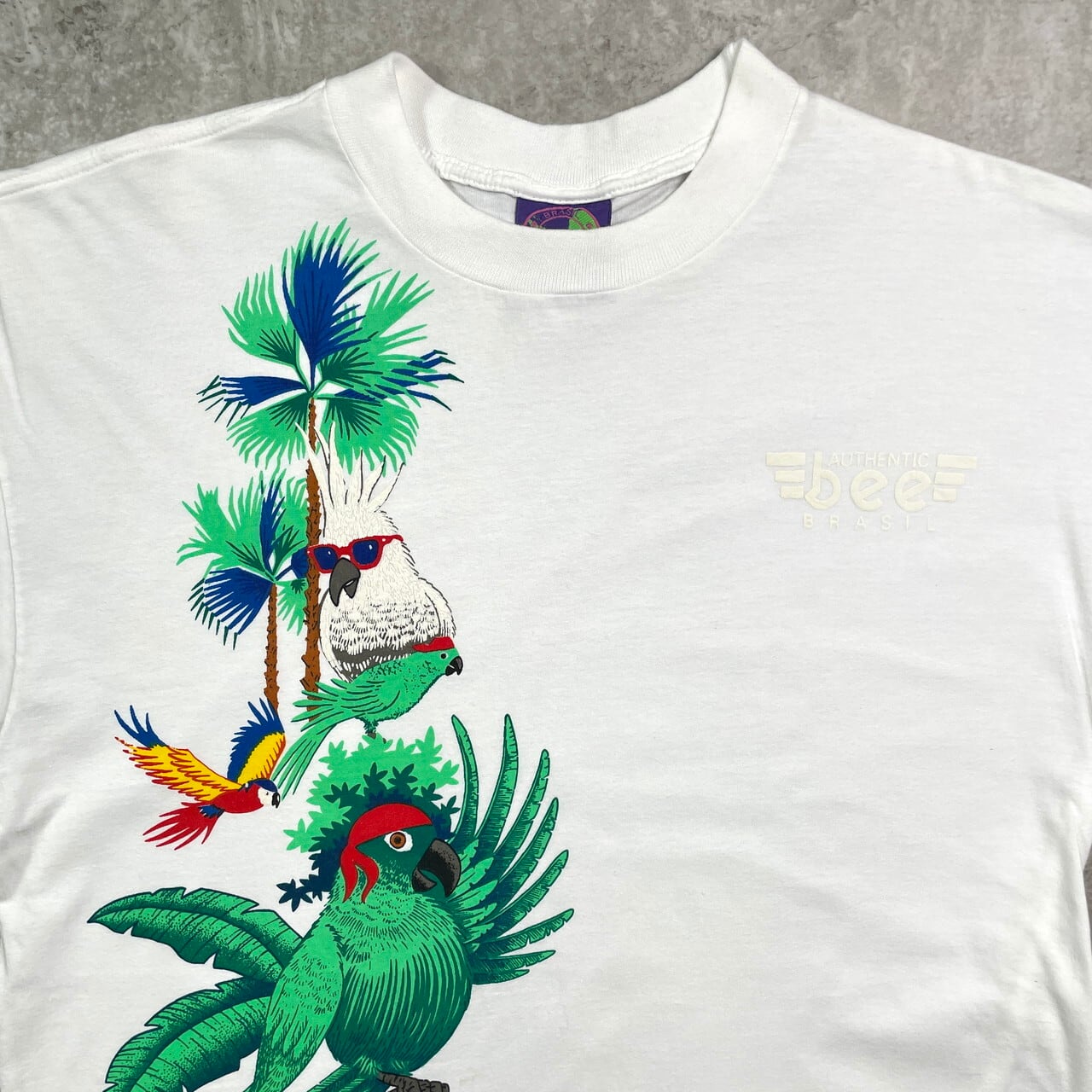 ■bee 鳥 アニマルプリントTシャツ メンズM 古着 アート 白色【Tシャツ】/ホワイト