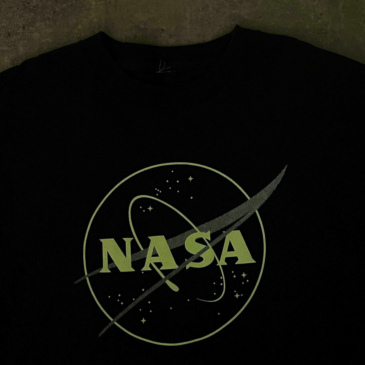 ■NASA 企業ロゴ 蓄光プリントTシャツ メンズL相当 古着 アドバタイジング 宇宙 紺色【Tシャツ】/ネイビー