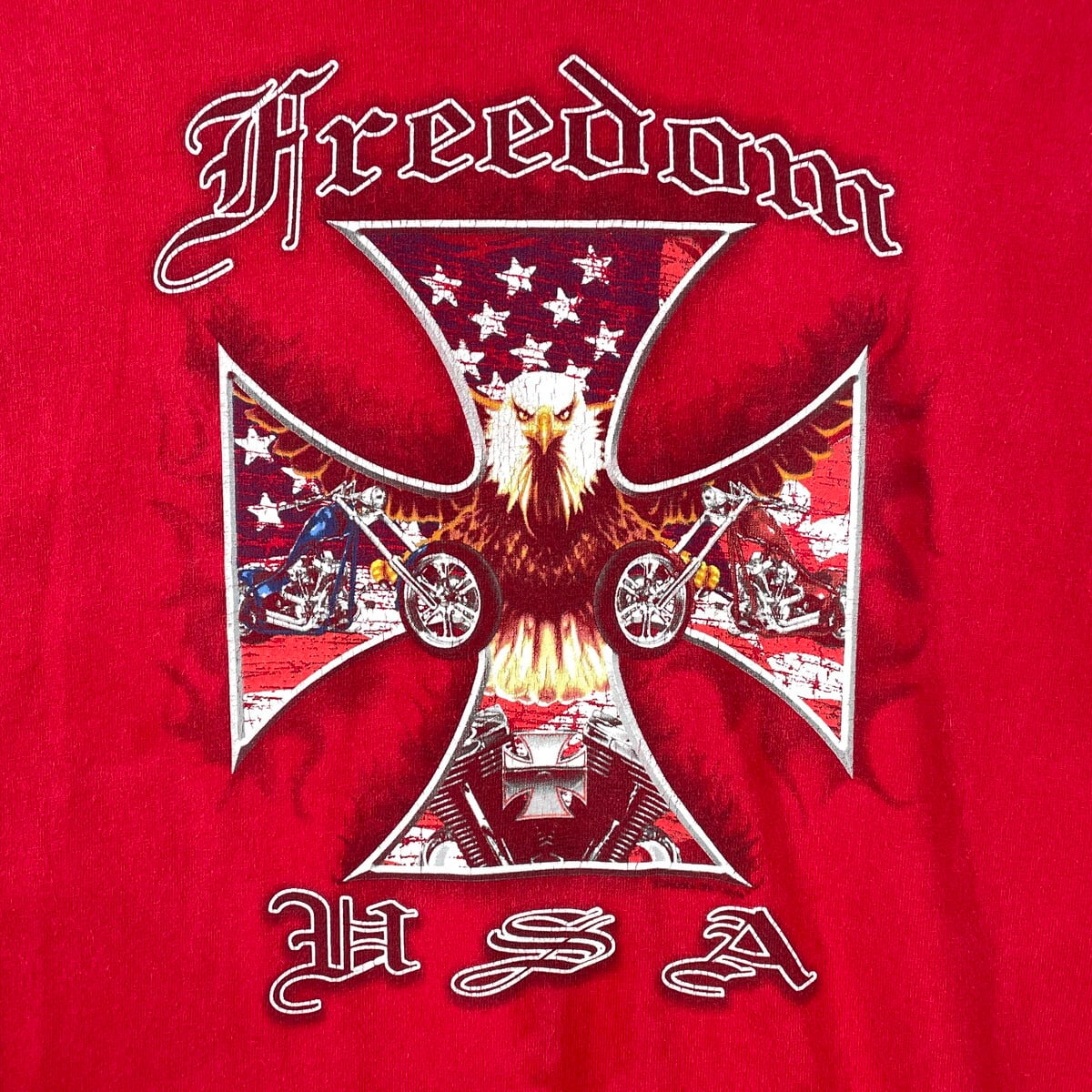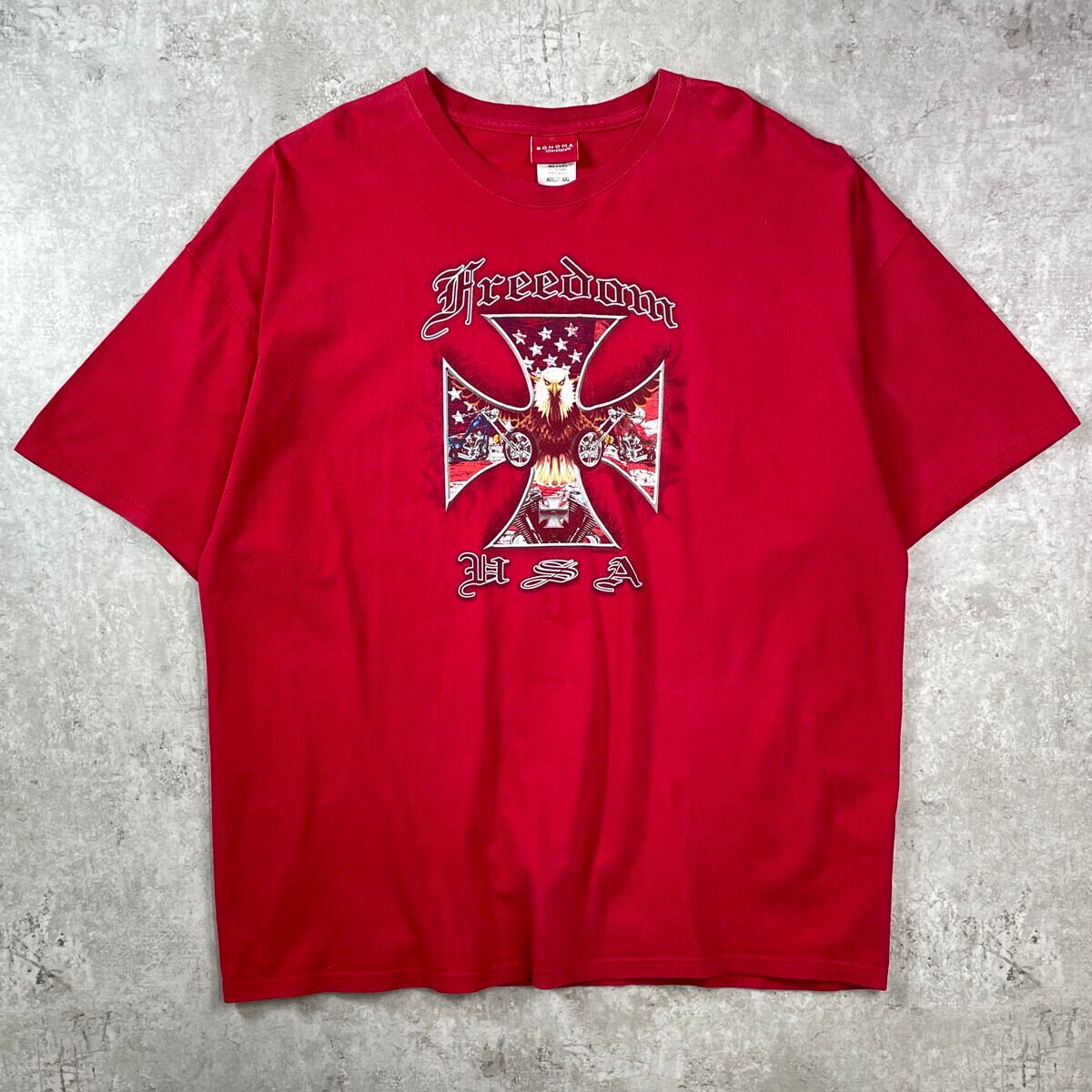 FREEDOM USA アイアンクロス イーグル バイク プリント Tシャツ メンズ2XL 古着 モーターサイクル ビッグサイズ 大きいサイズ 赤色【Tシャツ】/レッド【SS50】