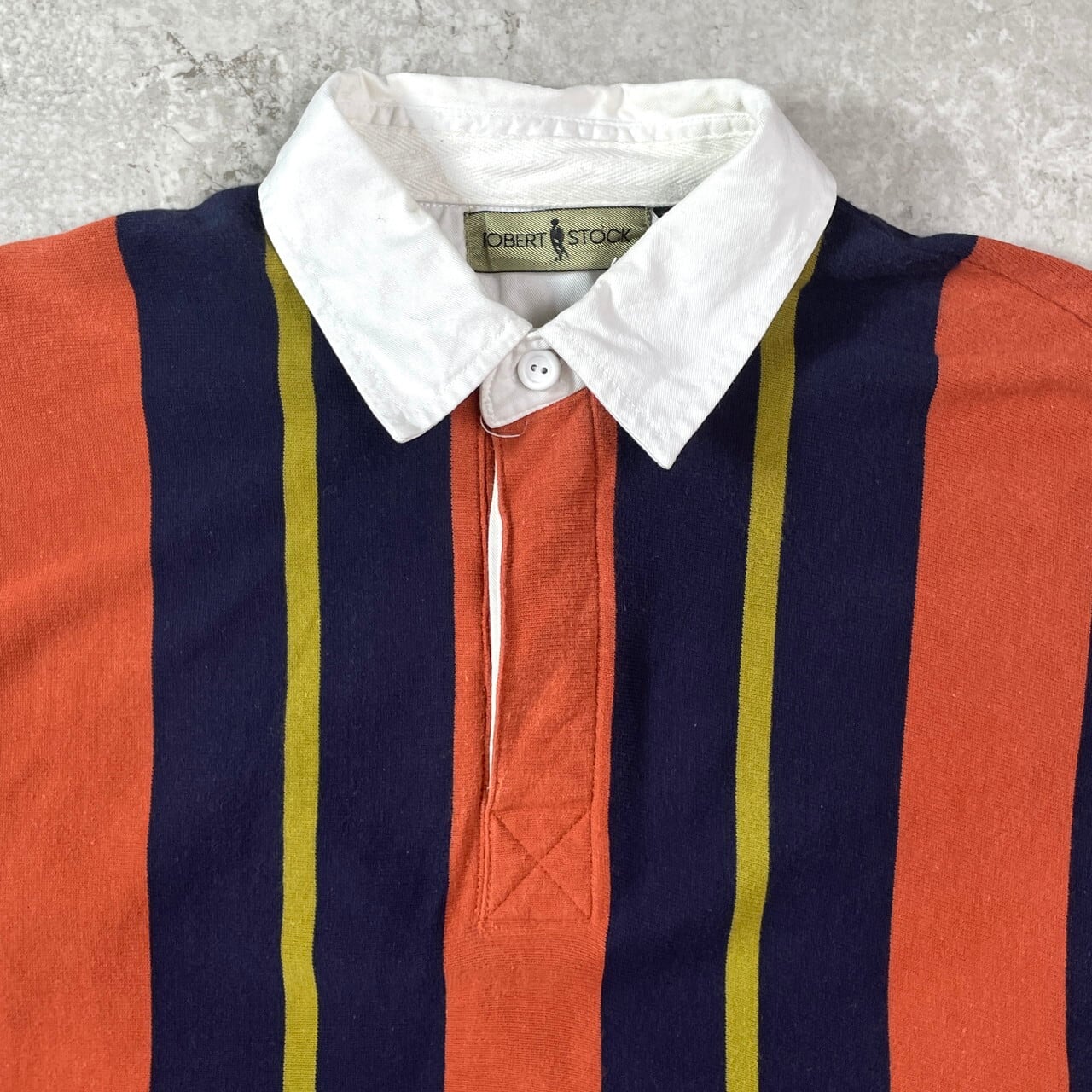 ■90年代 ROBERT STOCK マルチストライプ 長袖ラガーシャツ メンズXL相当 古着 90s VINTAGE ヴィンテージ ネイビー オレンジ イエロー【ポロシャツ・ラガーシャツ】/マルチカラー