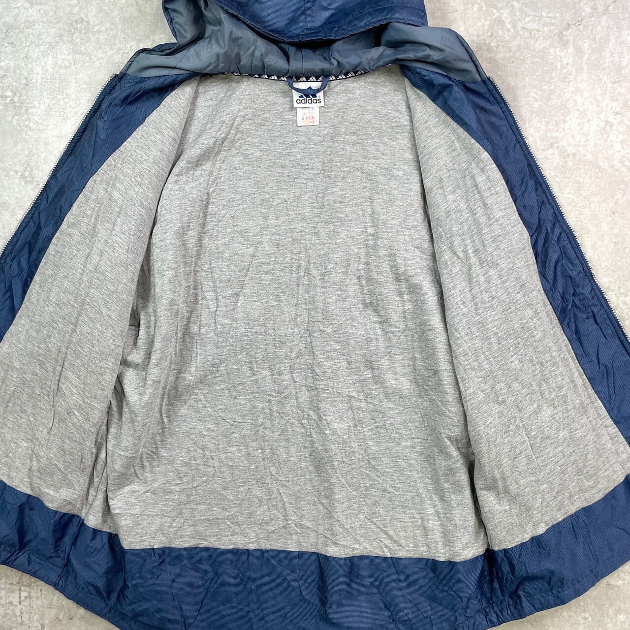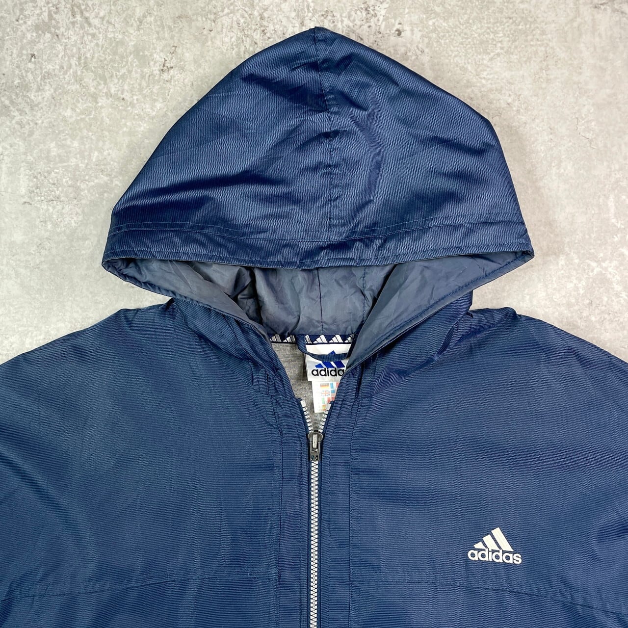 ■90年代 adidas アディダス 中綿入り ナイロンジャケット パフォーマンスロゴ メンズXL相当 古着 90s ヴィンテージ VINTAGE ナイロンパーカー フーディー 紺色【ナイロンジャケット】/ネイビー