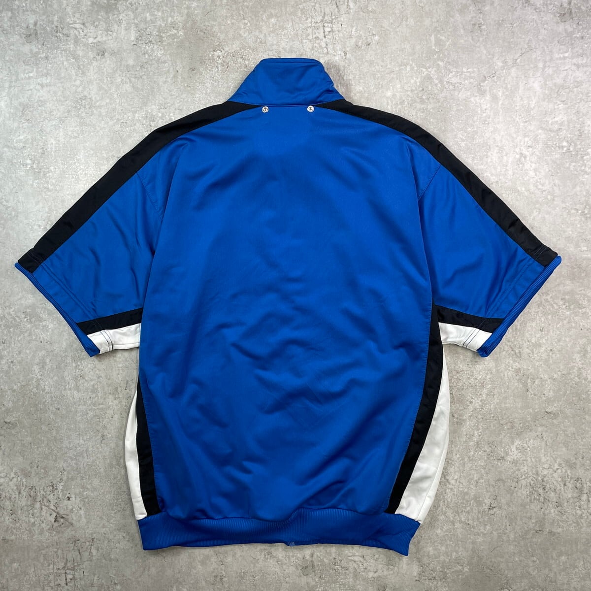80年代 adidas アディダス 半袖 ジャージ トラックジャケット トレフォイルロゴ メンズXL相当 古着 80s ヴィンテージ VINTAGE 切り替え 袖ロゴ 刺繍 サイドライン ハイネック ブルー ネイビー 青色 紺色 【ジャージ・トラックジャケット】/ブルー