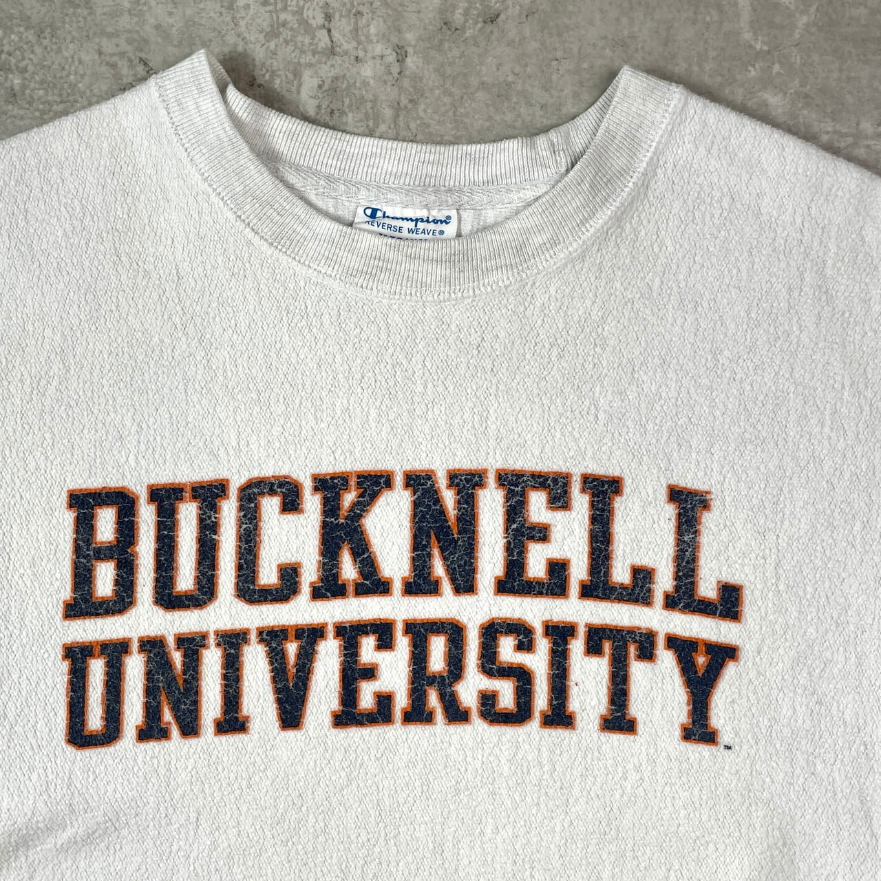■Champion チャンピオン リバースウィーブ BUCKNELL UNIVERSITY カレッジプリント スウェットシャツ メンズL相当 古着 アメカジ REVERSE WEAVE トレーナー 単色タグ 復刻 裏返し ライトグレー【スウェット】/ホワイト