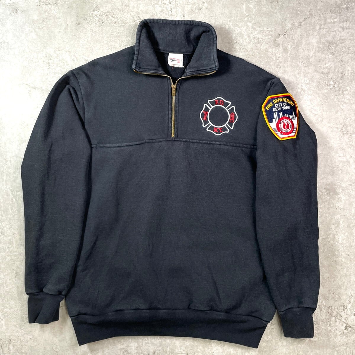 90年代 USA製 F.D.N.Y. ニューヨーク消防局 ロゴ刺繍 ハーフジップスウェットシャツ メンズM~L相当 古着 90s ヴィンテージ VINTAGE アメカジ トレーナー ハンドウォーマーポケット付き ハイネック 黒色【スウェット】/ブラック