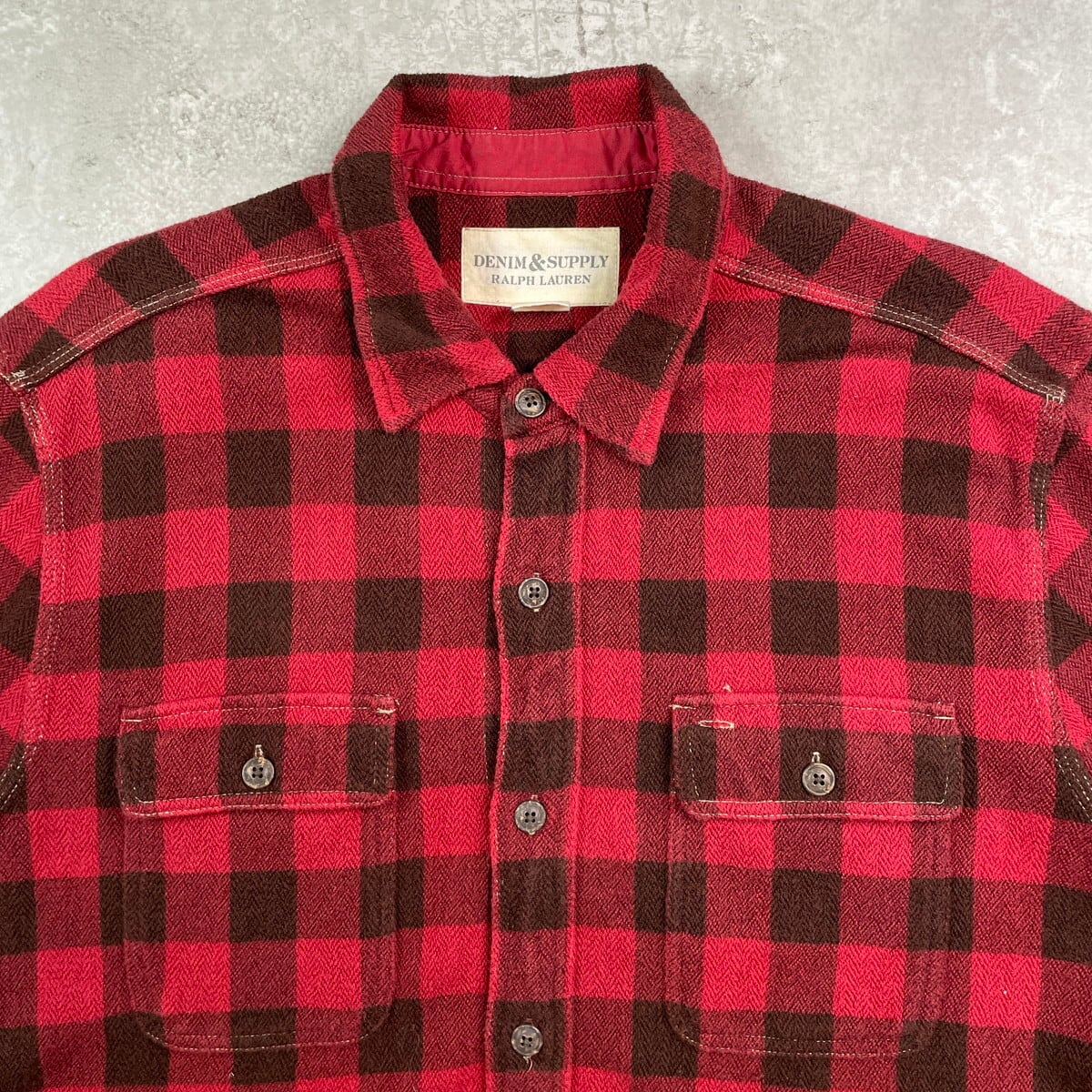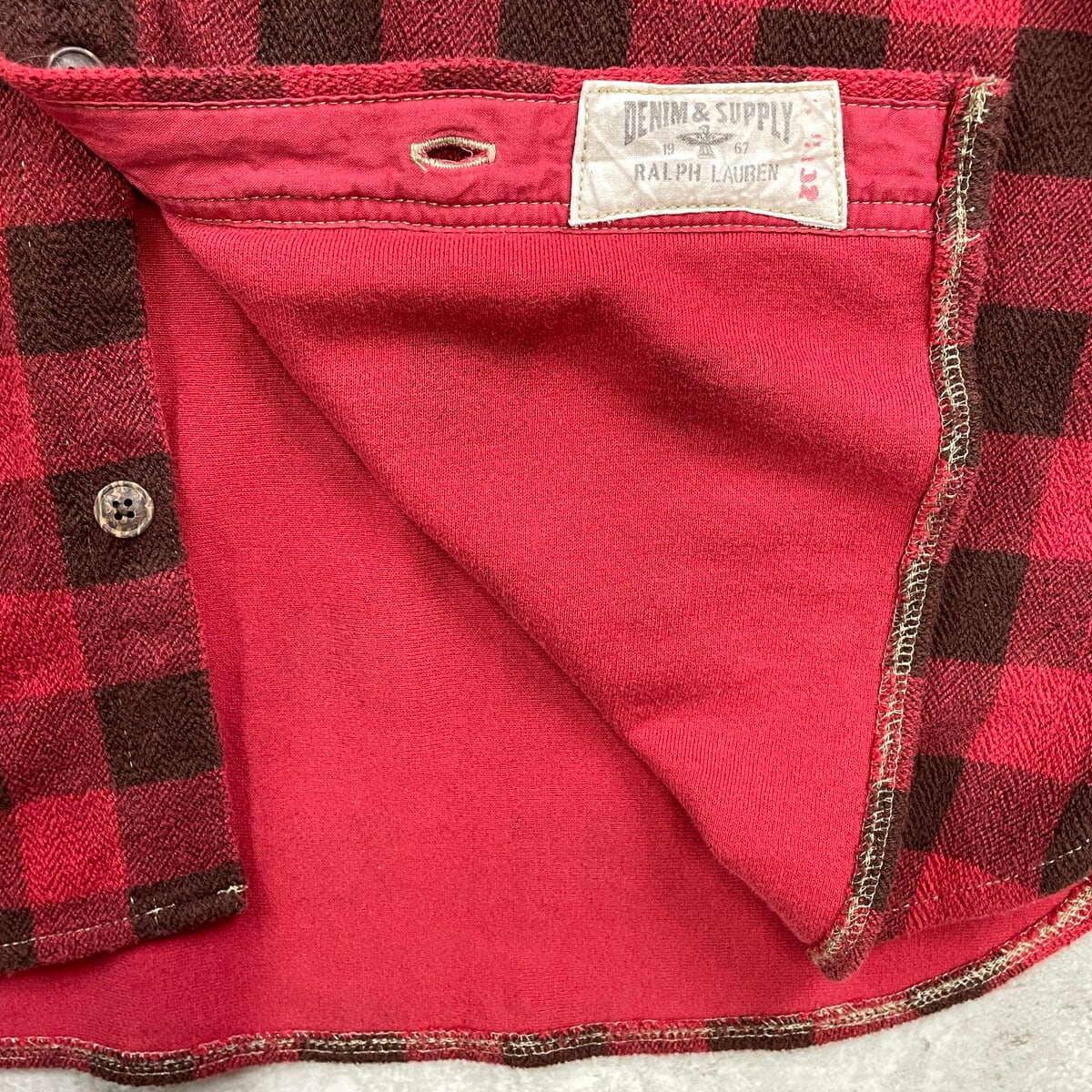 ■DENIM & SUPPLY Ralph Lauren ラルフローレン ブロックチェック ダブルポケットシャツ メンズXL 古着 アメカジ ワンポイントロゴ タオル地 マチ付き 赤色 ブラック【長袖シャツ】/レッド