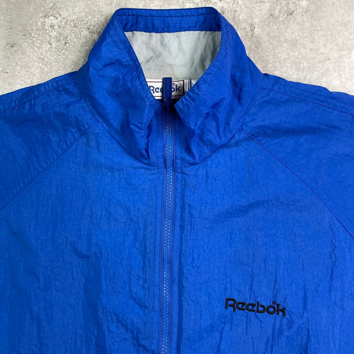 90年代 Reebok リーボック ナイロンジャケット ロゴ刺繍 メンズXL相当 古着 90s ヴィンテージ VINTAGE メッシュライナー ドローコード付き ツートンカラー ブルー×ブラック【ナイロンジャケット】/ブルー