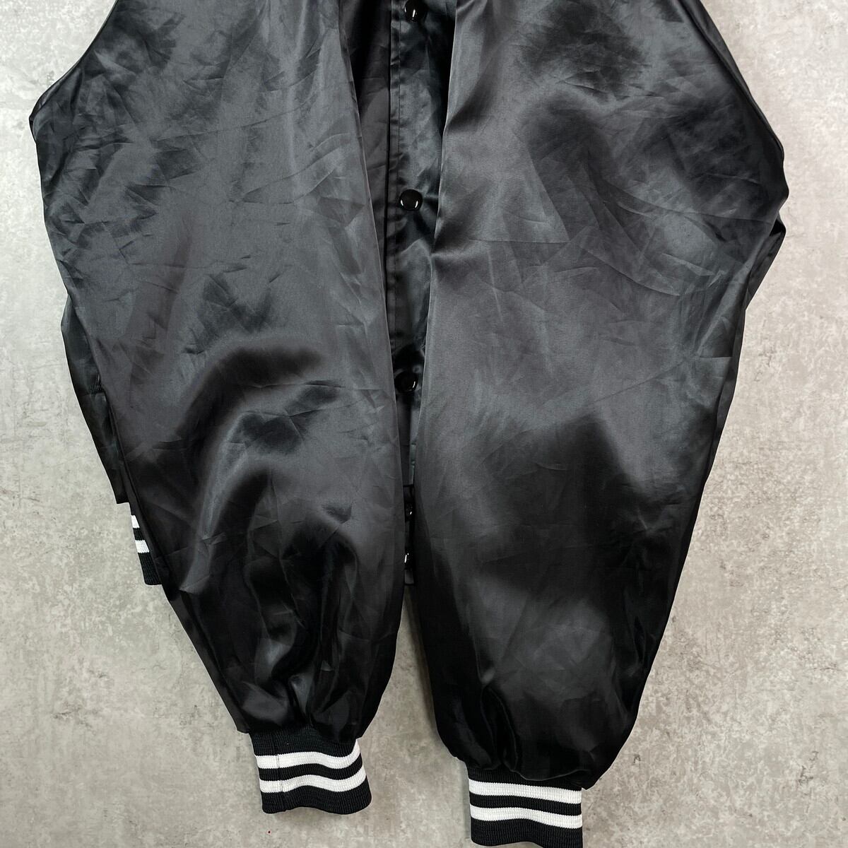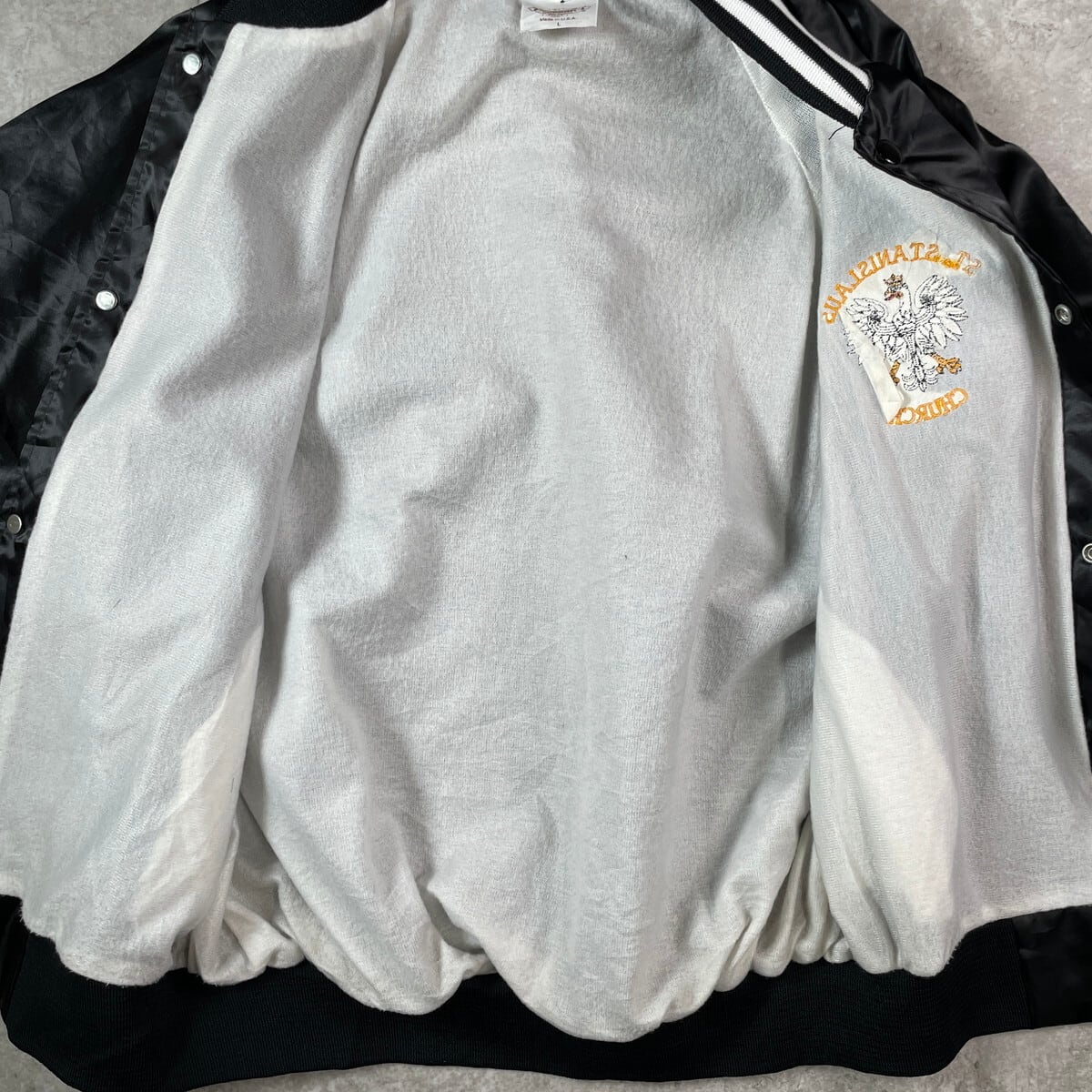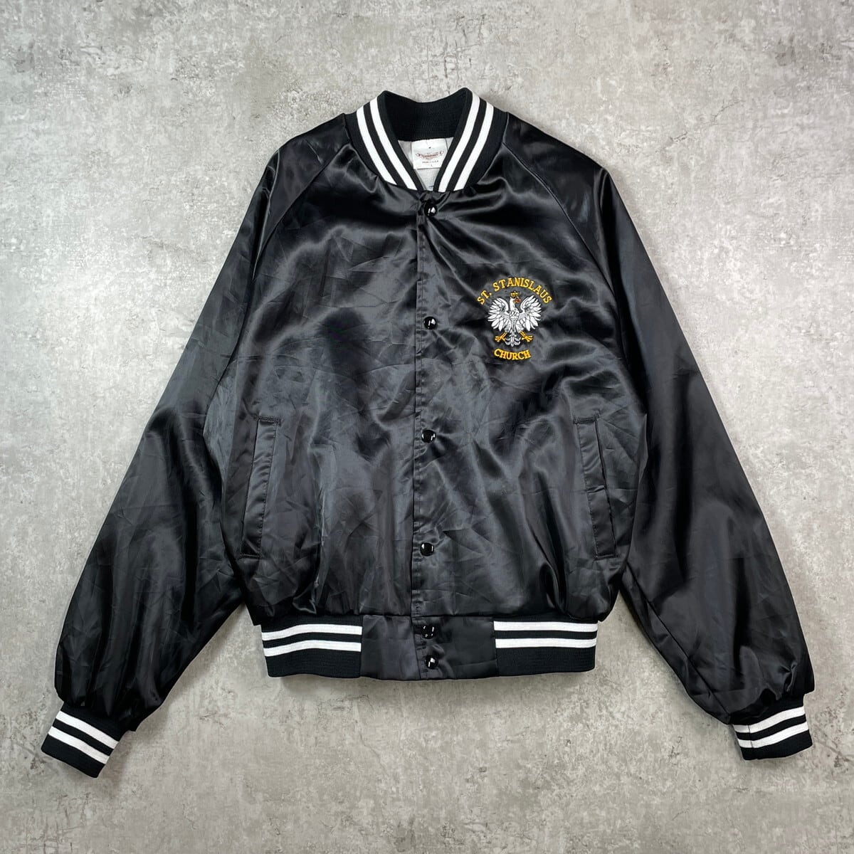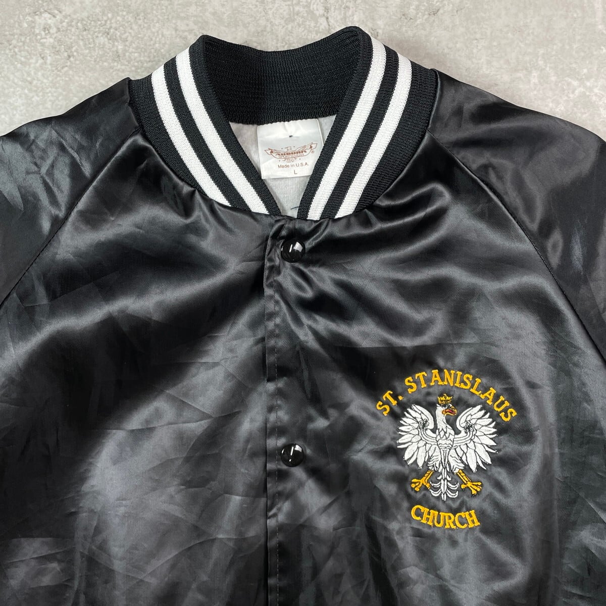 ■90年代 USA製 AUBURN SPORTWEAR ナイロン サテンスタジャン 企業ロゴ刺繍 メンズL 古着 90s アメカジ ヴィンテージ VINTAGE カトリック教会 黒色【ナイロンジャケット】/ブラック