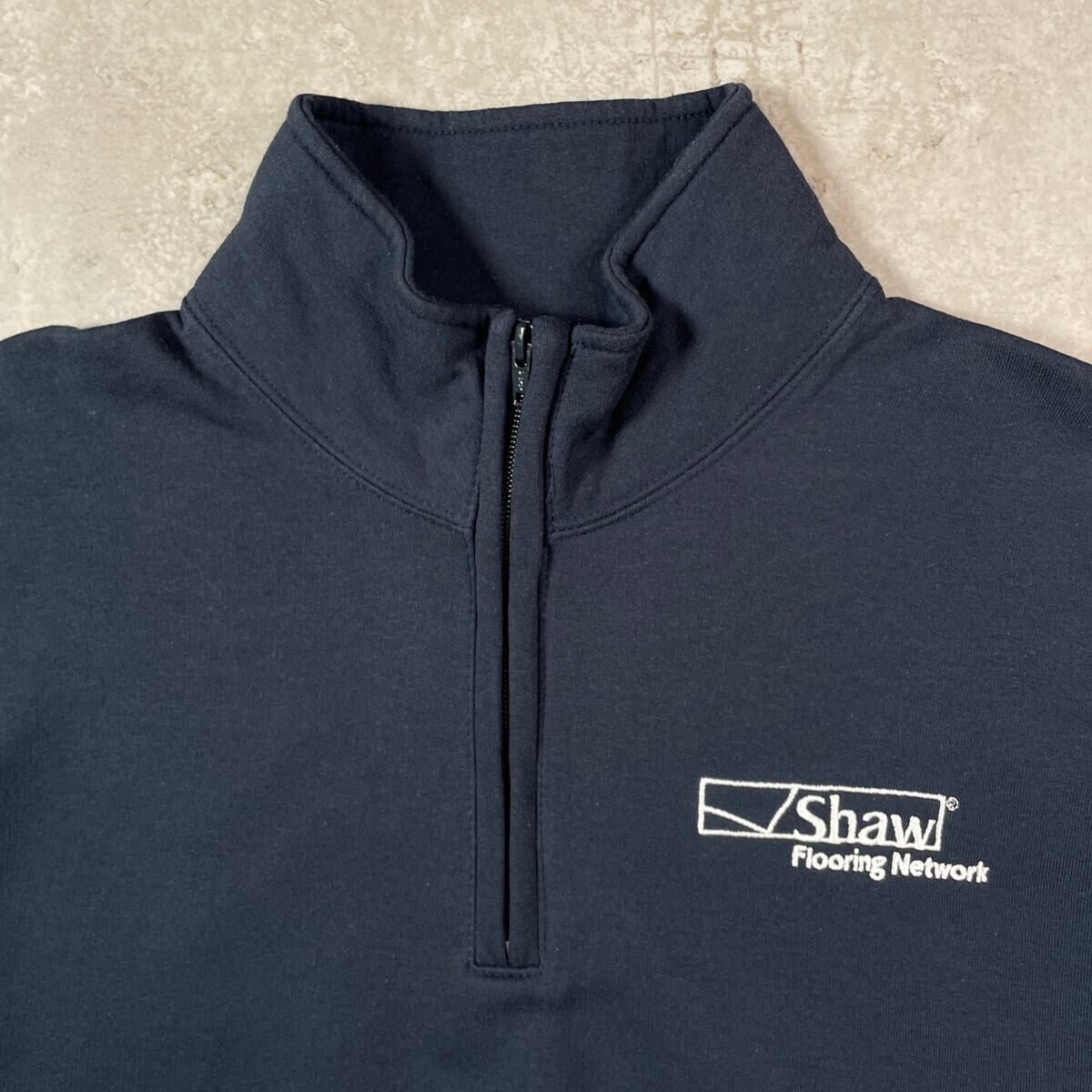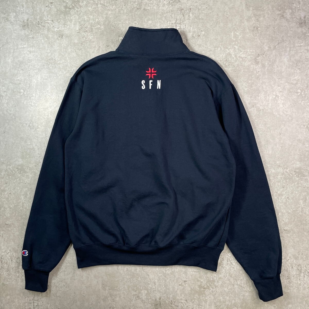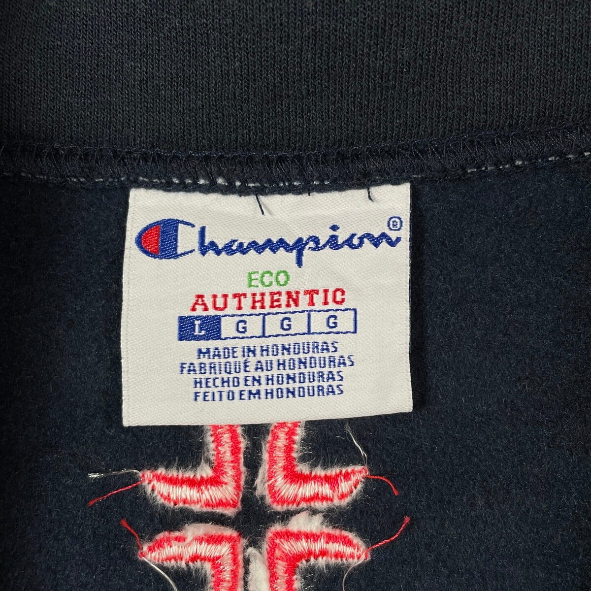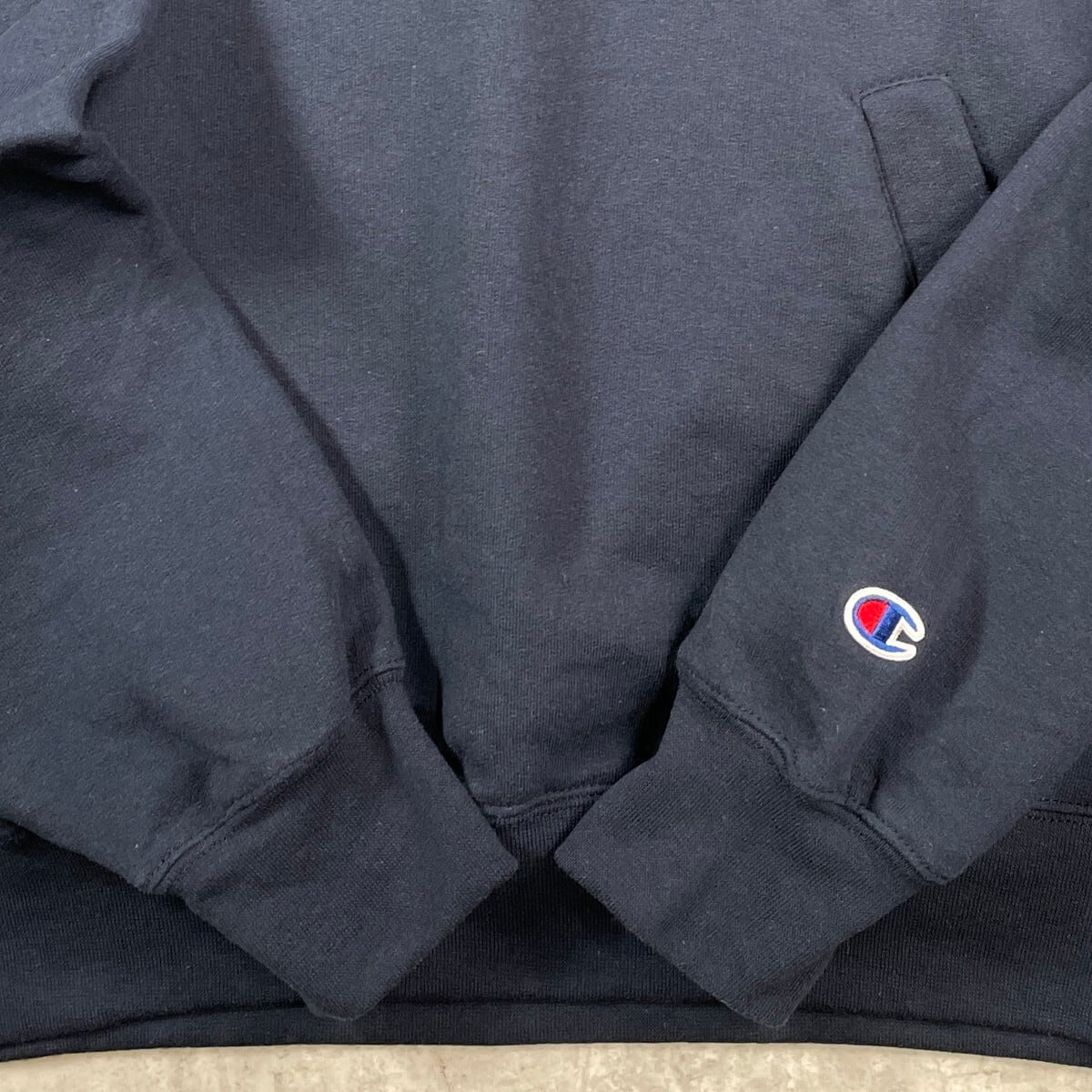 ■Champion チャンピオン ハーフジップスウェット ワンポイント企業ロゴ刺繍 メンズL 古着 ハンドポケット付き トレーナー 紺色【スウェット】/ネイビー