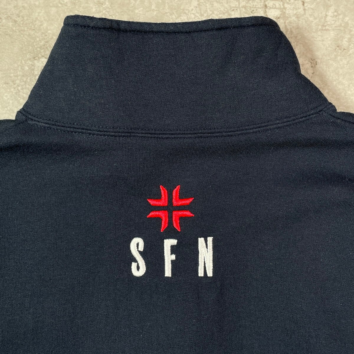 Champion チャンピオン ハーフジップスウェット ワンポイント企業ロゴ刺繍 メンズL 古着 ハンドポケット付き トレーナー 紺色【スウェット】/ネイビー
