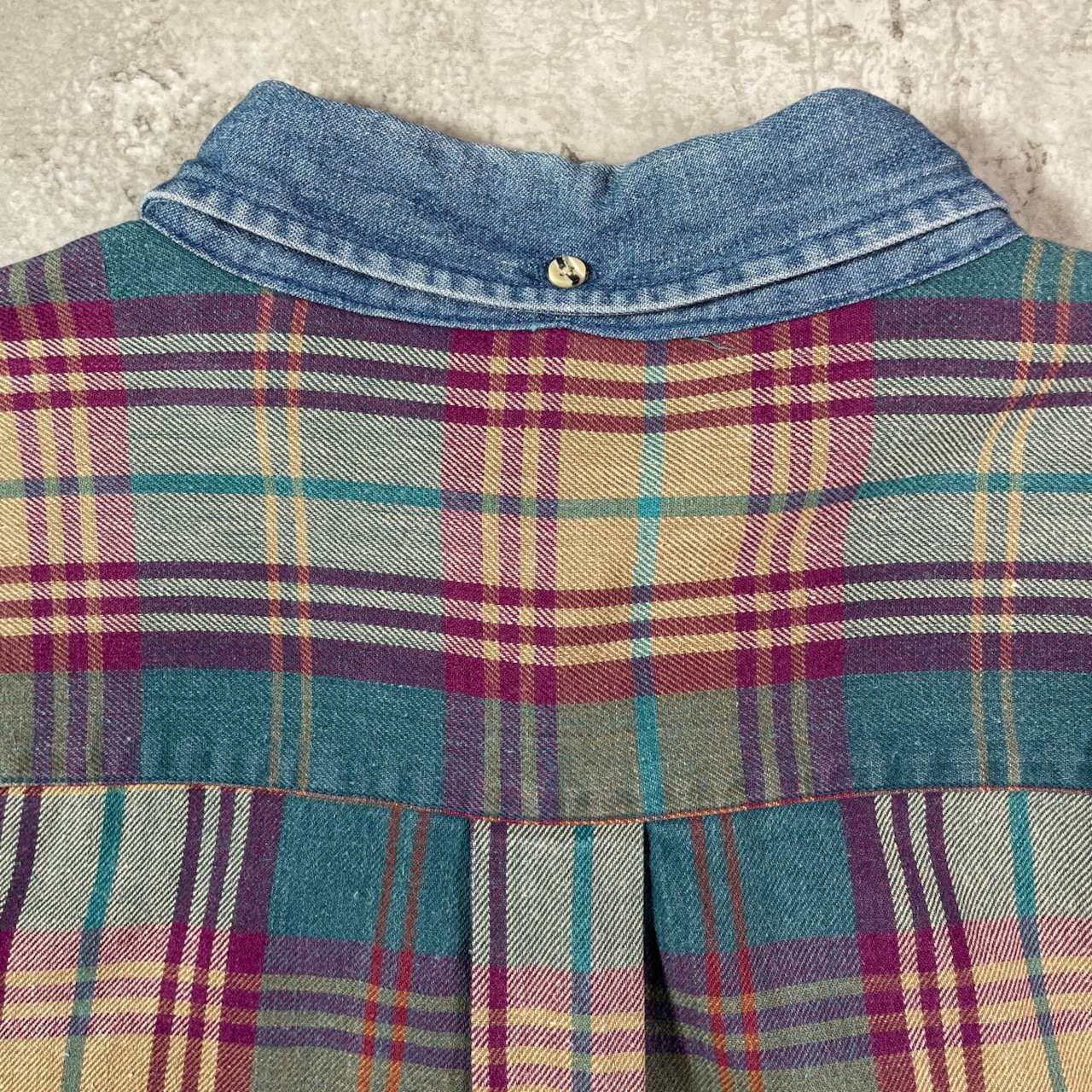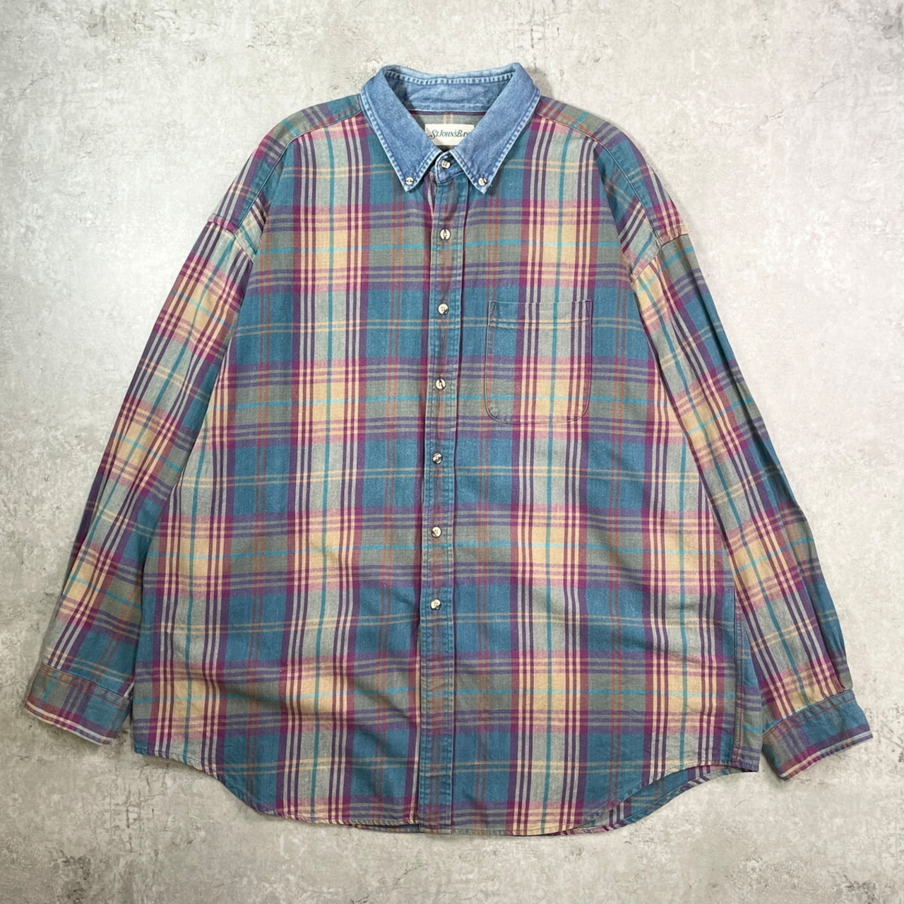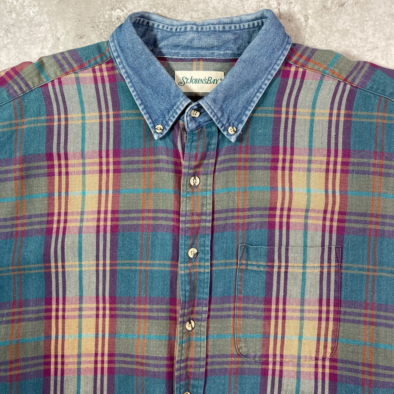 90年代 ST. JOHN'S BAY セントジョンズベイ コットン チェックシャツ デニム襟 メンズ2XL 古着 90s VINTAGE ヴィンテージ B.D. ボタンダウンシャツ 胸ポケ付き ビッグサイズ 大きいサイズ パープル ベージュ ターコイズブルー オレンジ【長袖シャツ】/マルチカラー