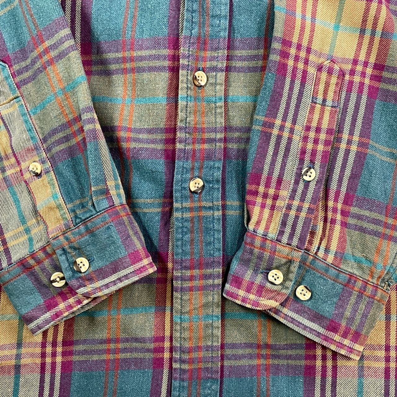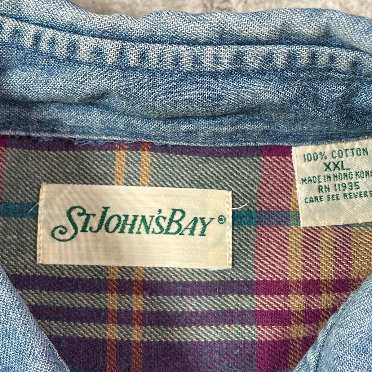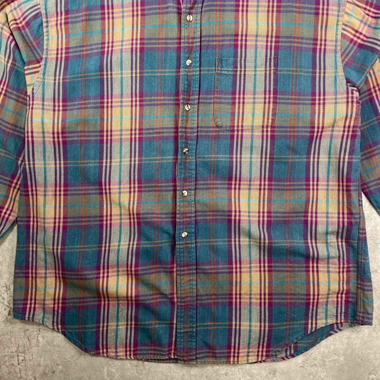 90年代 ST. JOHN'S BAY セントジョンズベイ コットン チェックシャツ デニム襟 メンズ2XL 古着 90s VINTAGE ヴィンテージ B.D. ボタンダウンシャツ 胸ポケ付き ビッグサイズ 大きいサイズ パープル ベージュ ターコイズブルー オレンジ【長袖シャツ】/マルチカラー