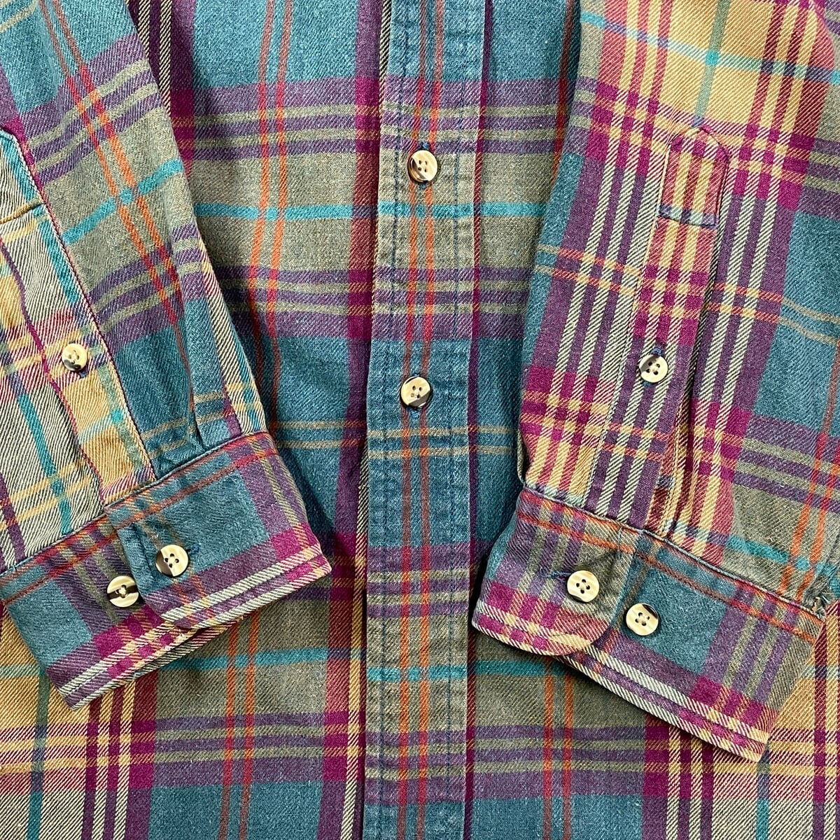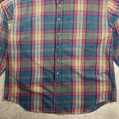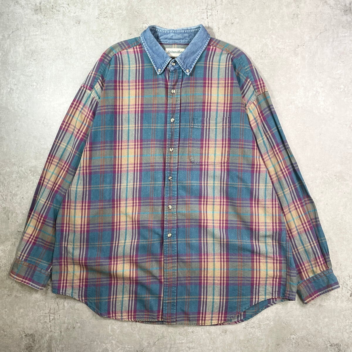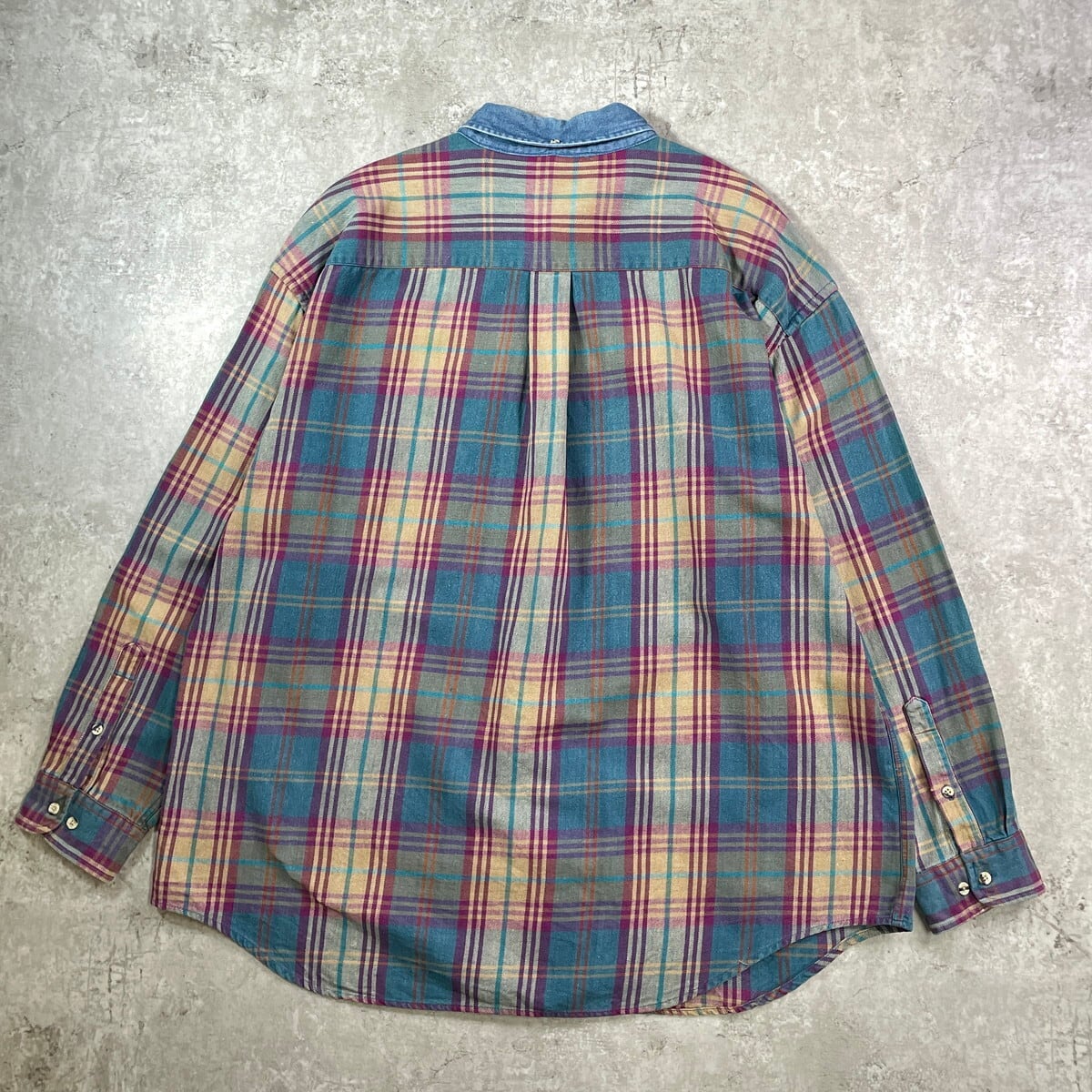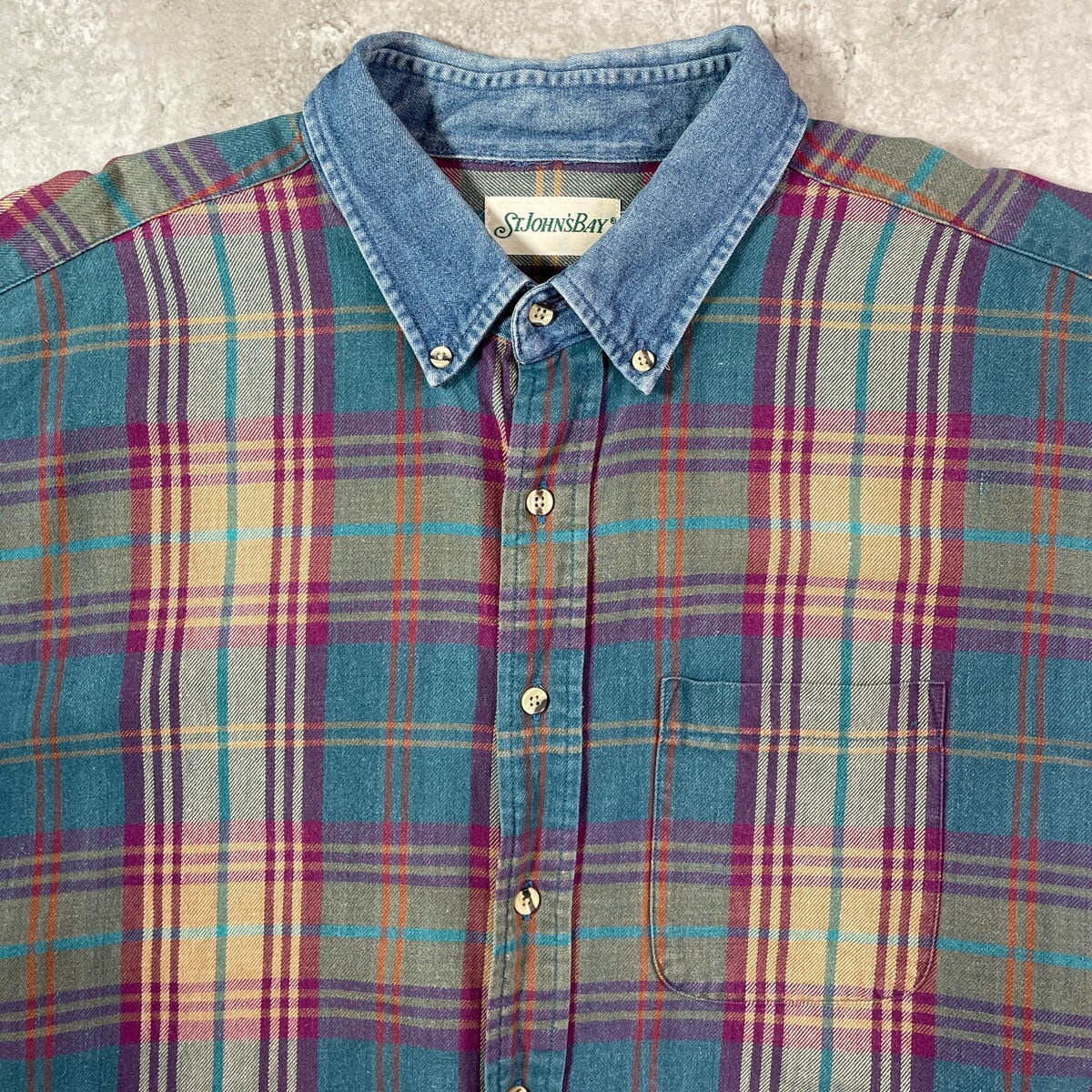 ■90年代 ST. JOHN'S BAY セントジョンズベイ コットン チェックシャツ デニム襟 メンズ2XL 古着 90s VINTAGE ヴィンテージ B.D. ボタンダウンシャツ 胸ポケ付き ビッグサイズ 大きいサイズ パープル ベージュ ターコイズブルー オレンジ【長袖シャツ】/マルチカラー