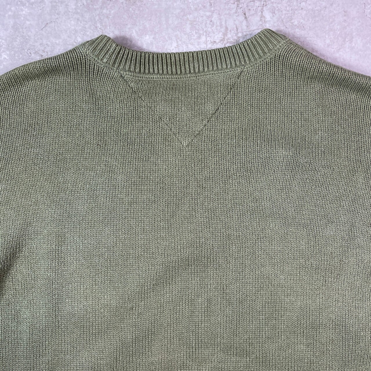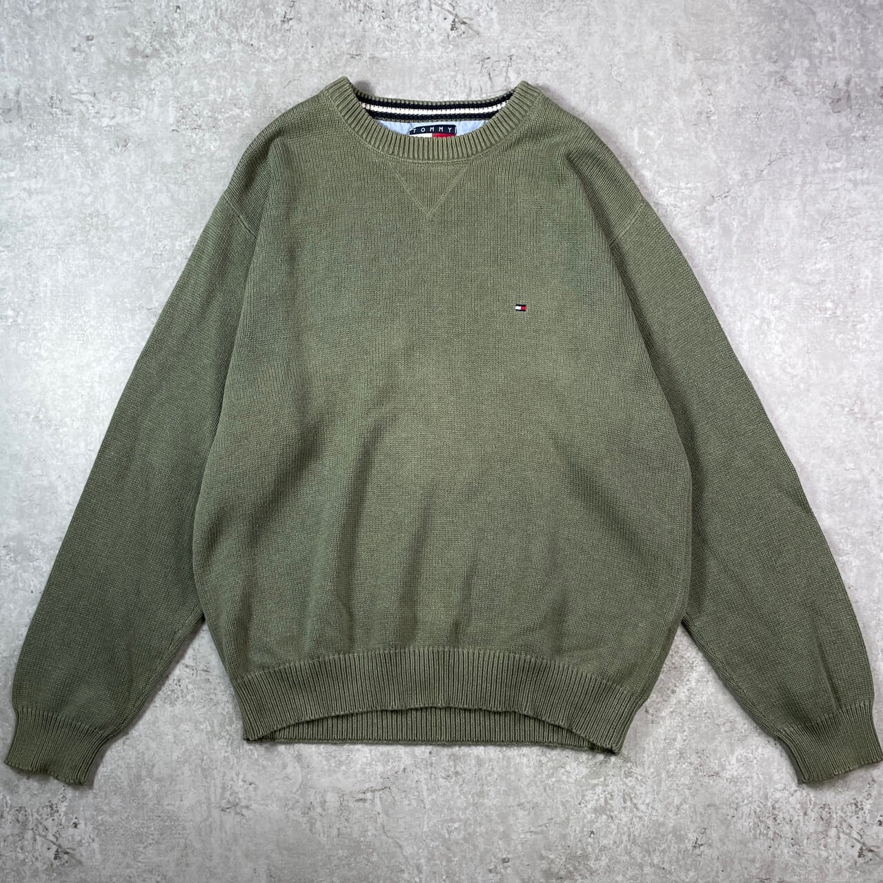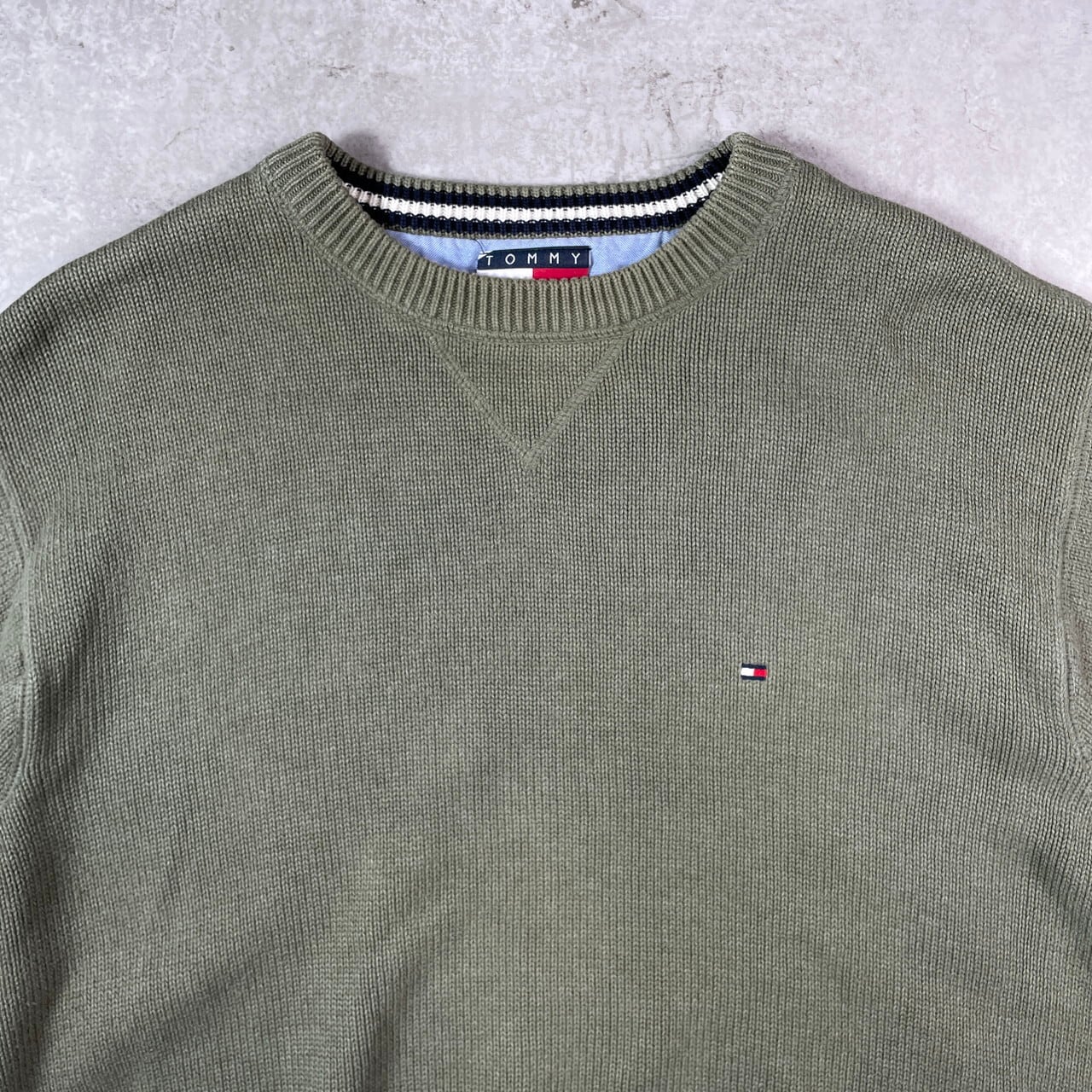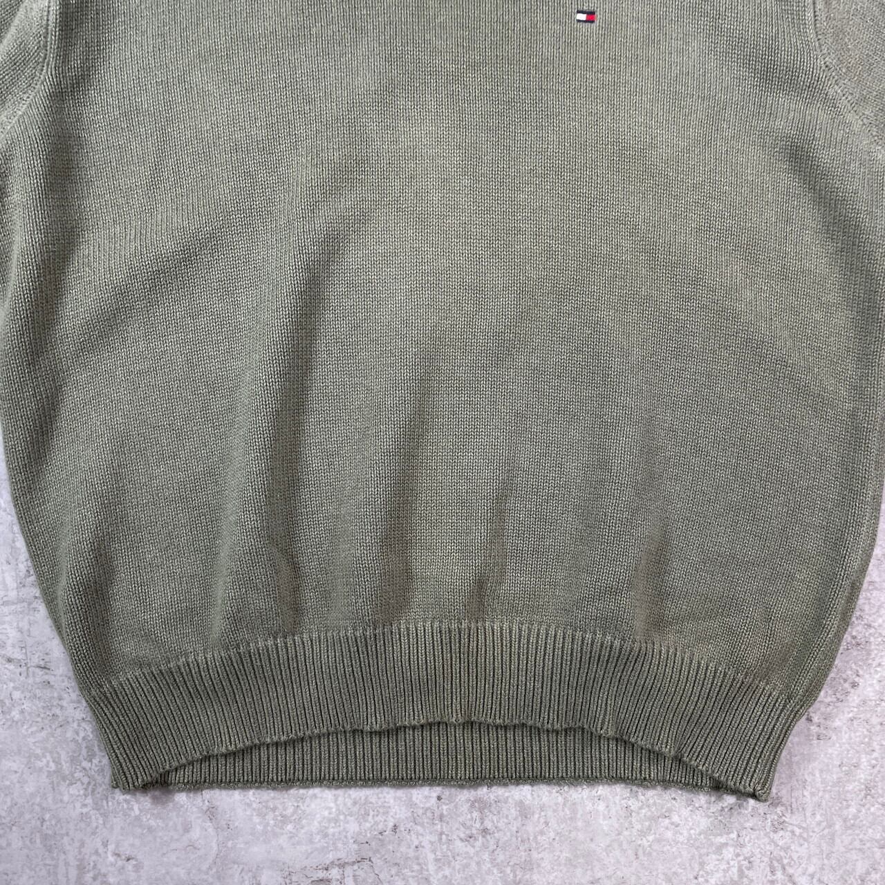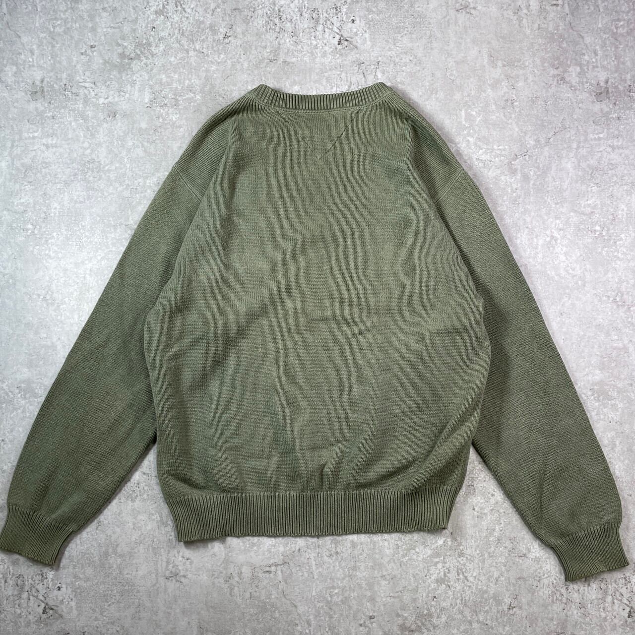 90年代 TOMMY HILFIGER トミーヒルフィガー ワンポイントロゴ刺繍 コットンニットセーター メンズXL 古着 90s VINTAGE ヴィンテージ 前Vガゼット 抹茶グリーン 緑【ニットセーター】/グリーン