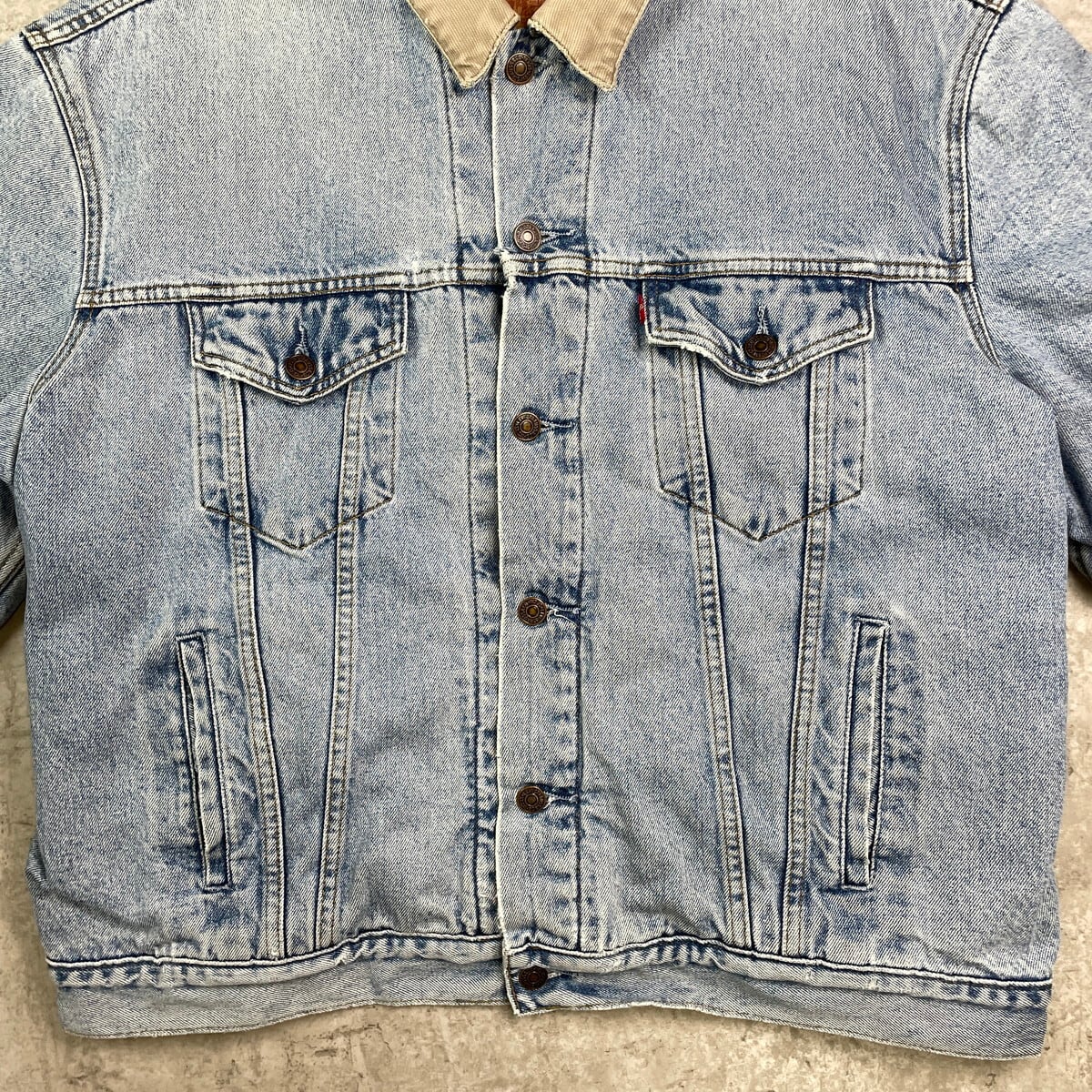 90年代 チュニジア製 Levi's ユーロリーバイス 71168 トラッカージャケット メンズ2XL 古着 90s VINTAGE ヴィンテージ アメカジ シャドウチェックライナー コーデュロイ襟 ビッグサイズ 大きいサイズ【デニムジャケット】/ブルー