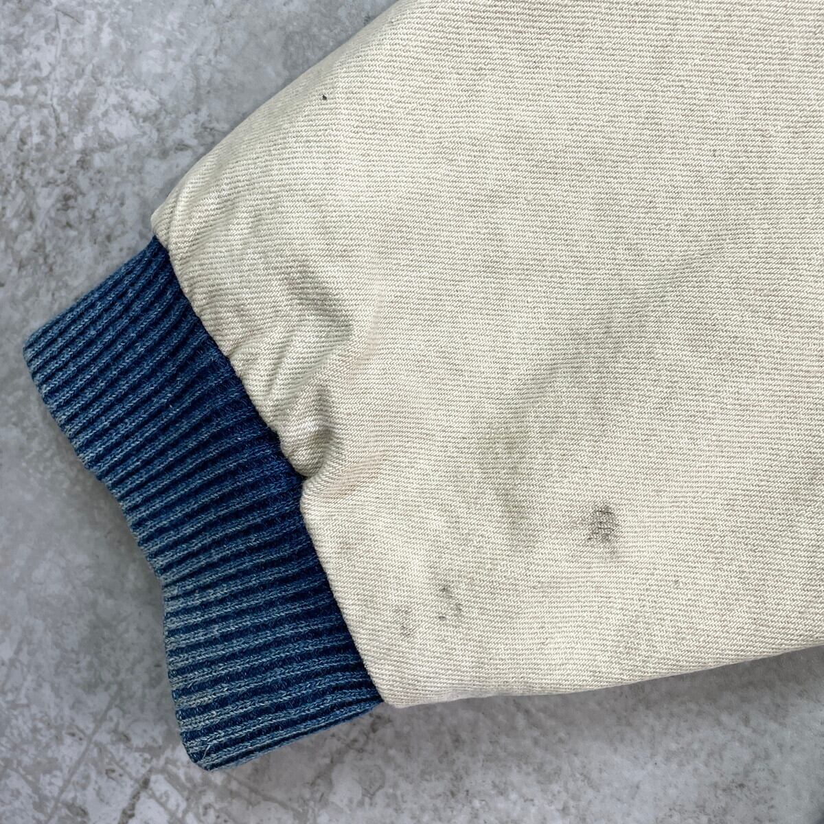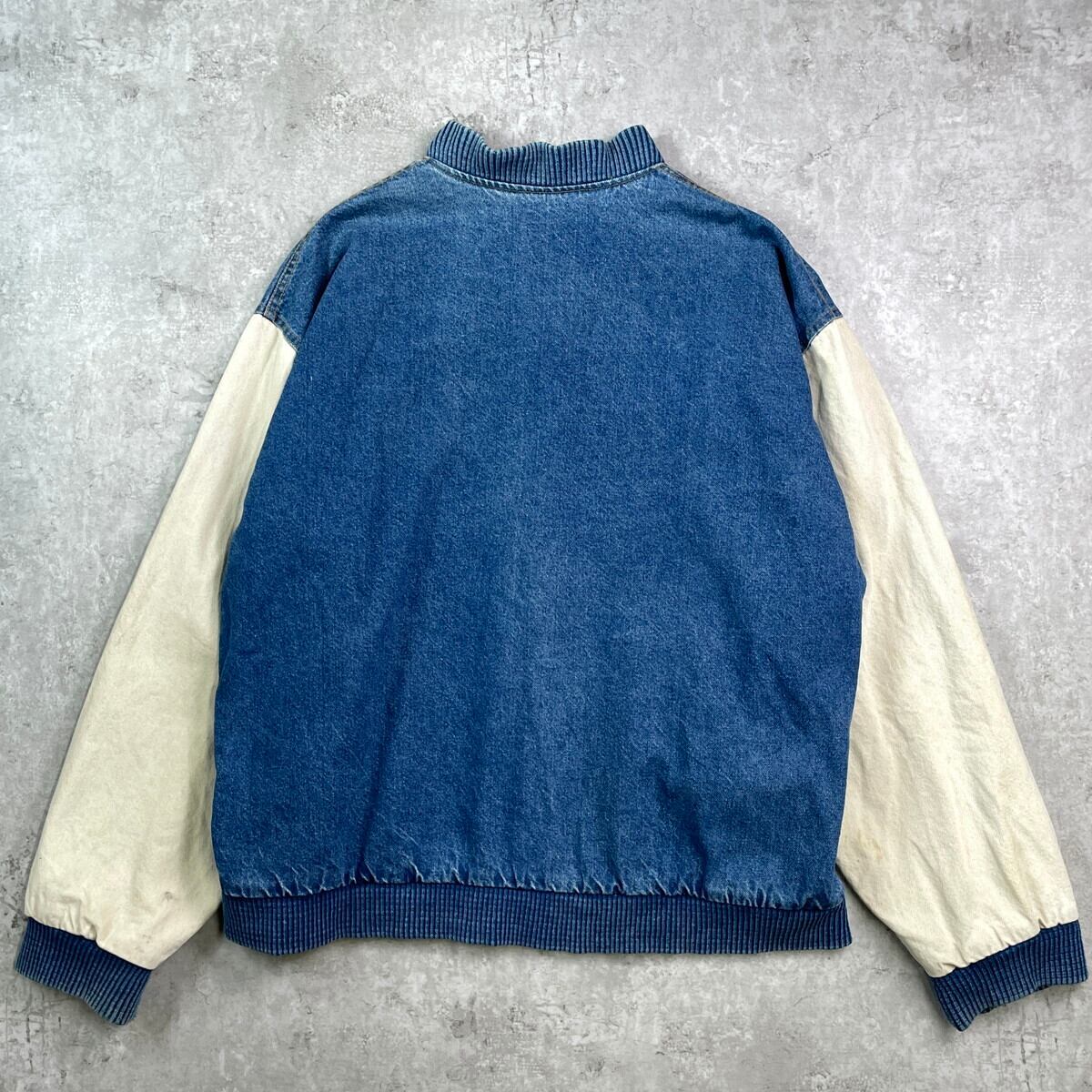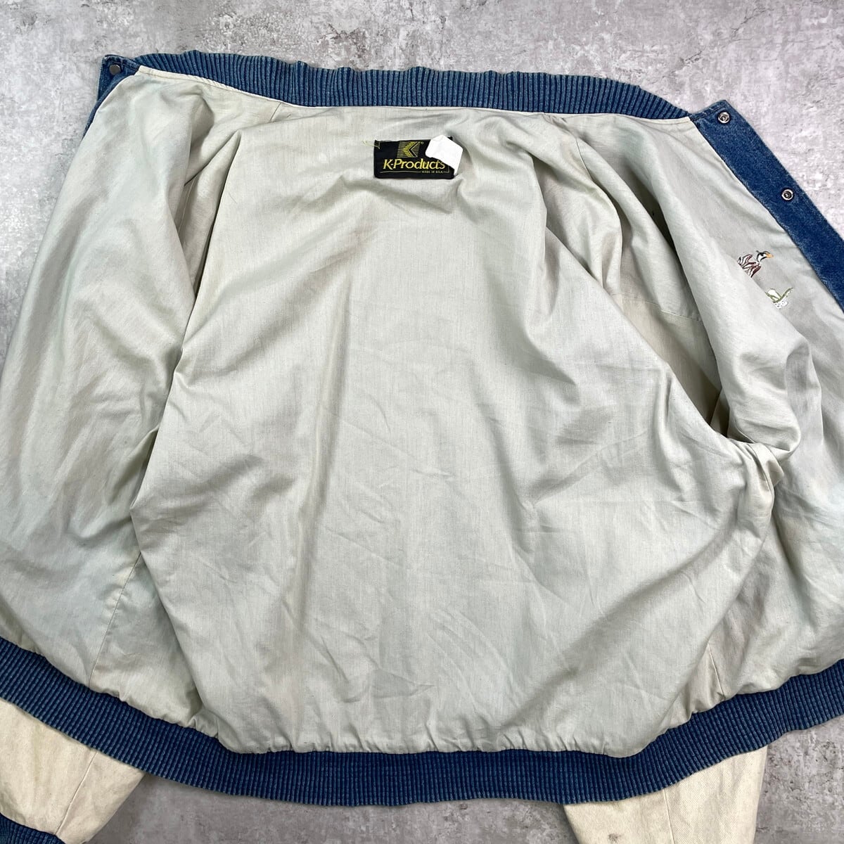 90年代 USA製 K-Products 企業ロゴ刺? デニムスタジャン デニムジャケット メンズXL 古着 90s VINTAGE ヴィンテージ アメカジ 袖切替 スナップボタン アニマル刺繍 カモ 青色 ホワイトベージュ【デニムジャケット】/ブルー【BS25-30b】