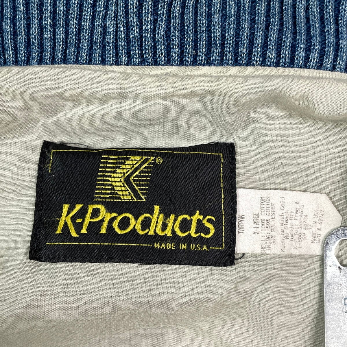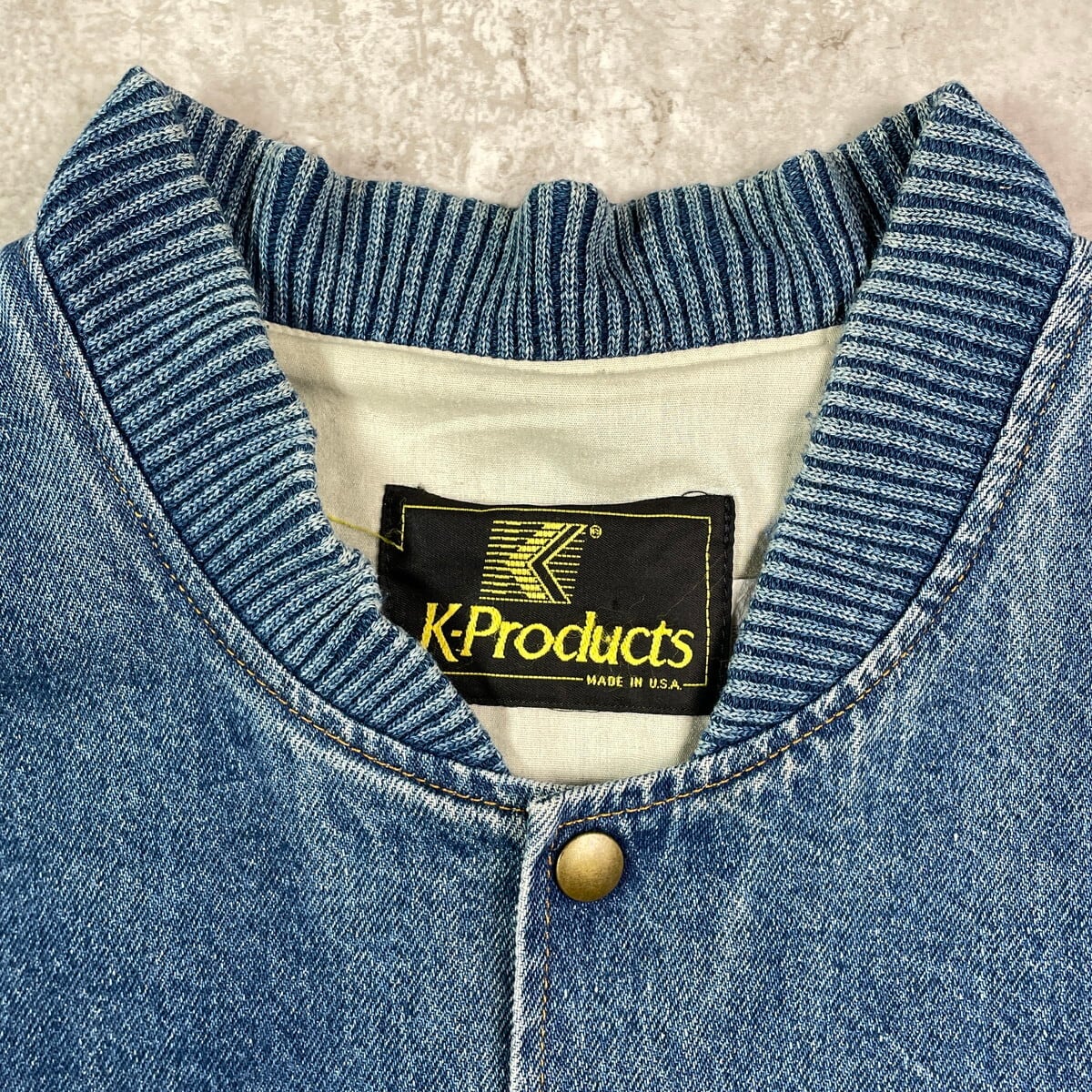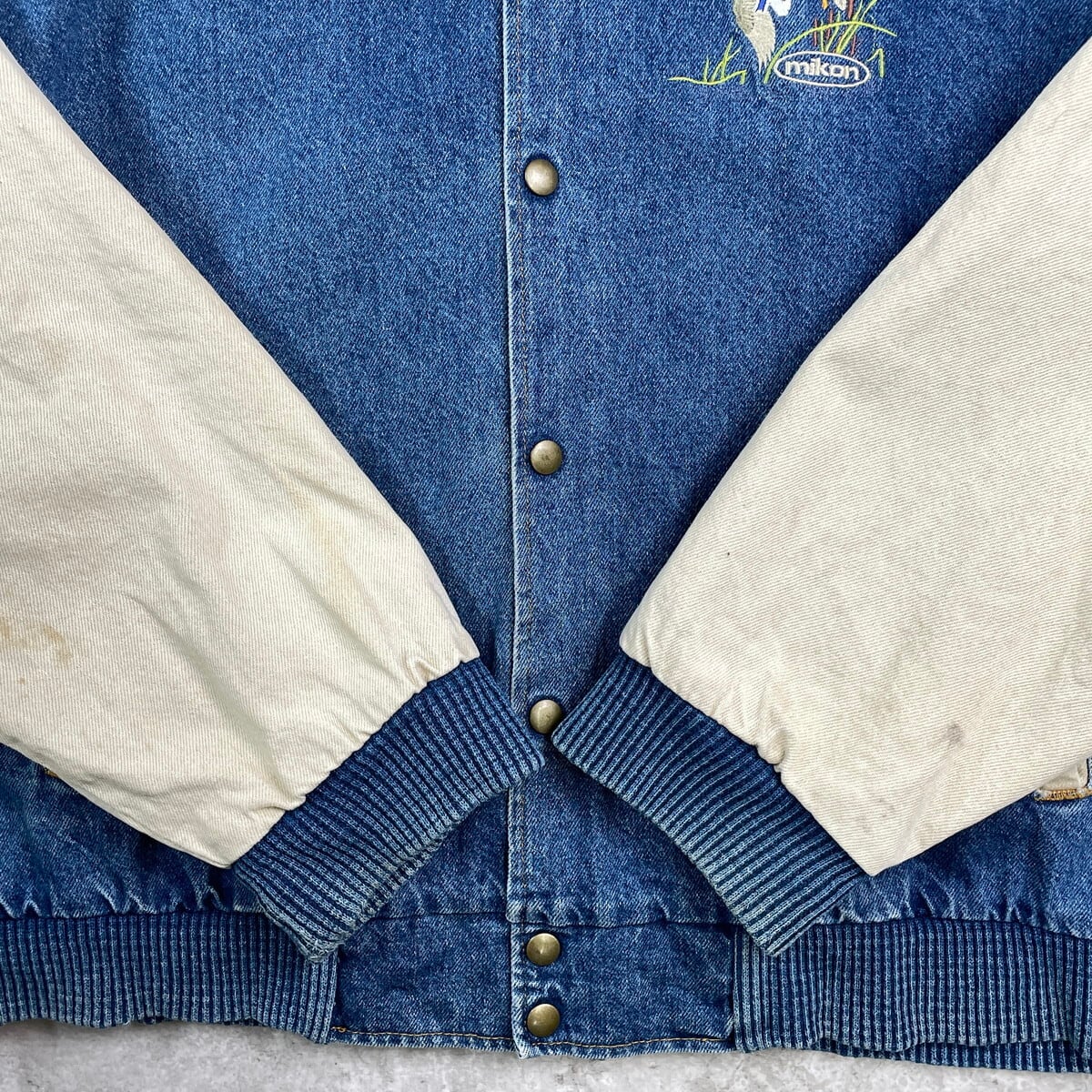 90年代 USA製 K-Products 企業ロゴ刺? デニムスタジャン デニムジャケット メンズXL 古着 90s VINTAGE ヴィンテージ アメカジ 袖切替 スナップボタン アニマル刺繍 カモ 青色 ホワイトベージュ【デニムジャケット】/ブルー【BS25-30b】