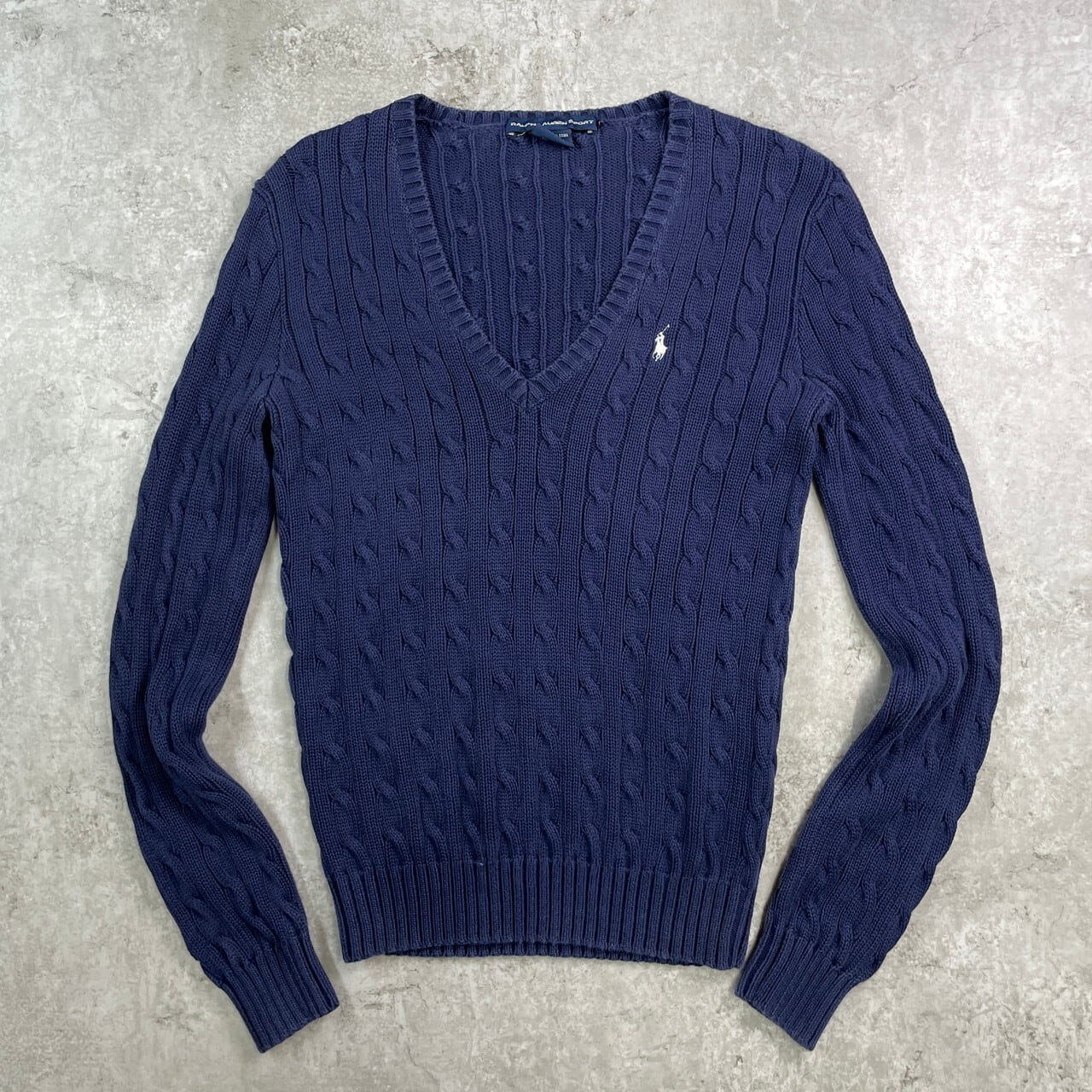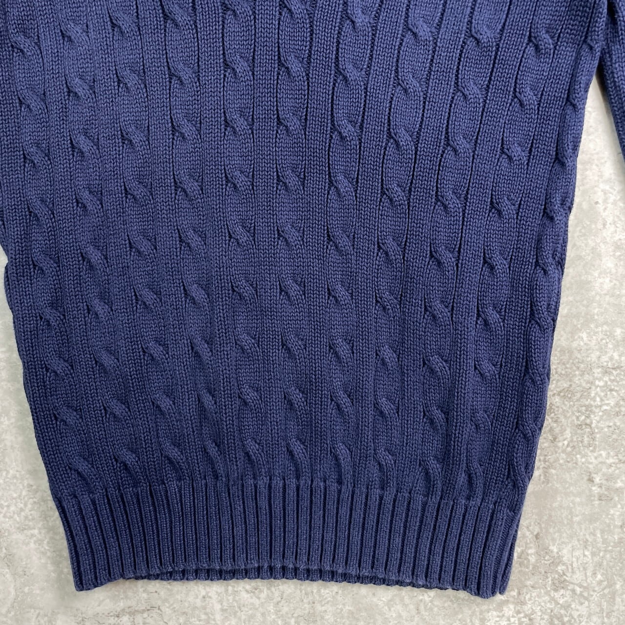 RALPH LAUREN SPORT ラルフローレン ケーブルニットセーター レディースM 古着 ワンポイントロゴ刺繍 アメカジ Vネック コットンニット 紺色【ニットセーター】/ネイビー