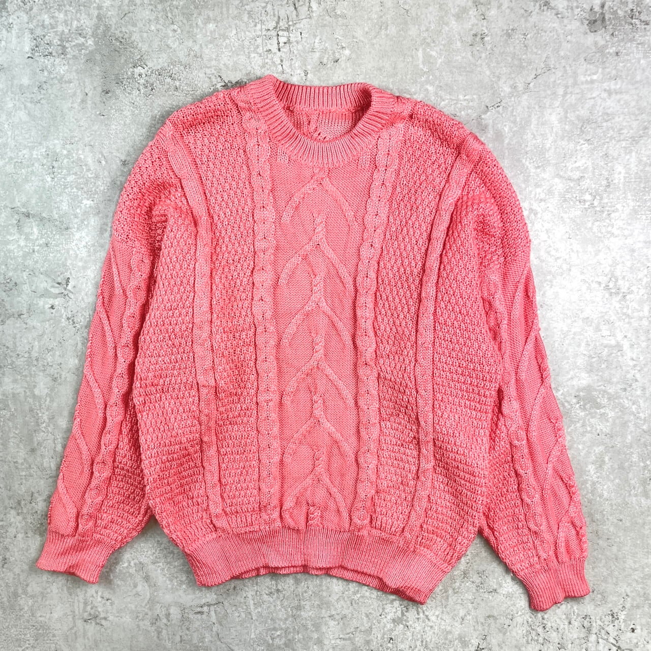 ■フィッシャーマンニットセーター メンズS相当 レディースL相当 古着 アランセーター ケーブルニット サーモンピンク【ニットセーター】/ピンク